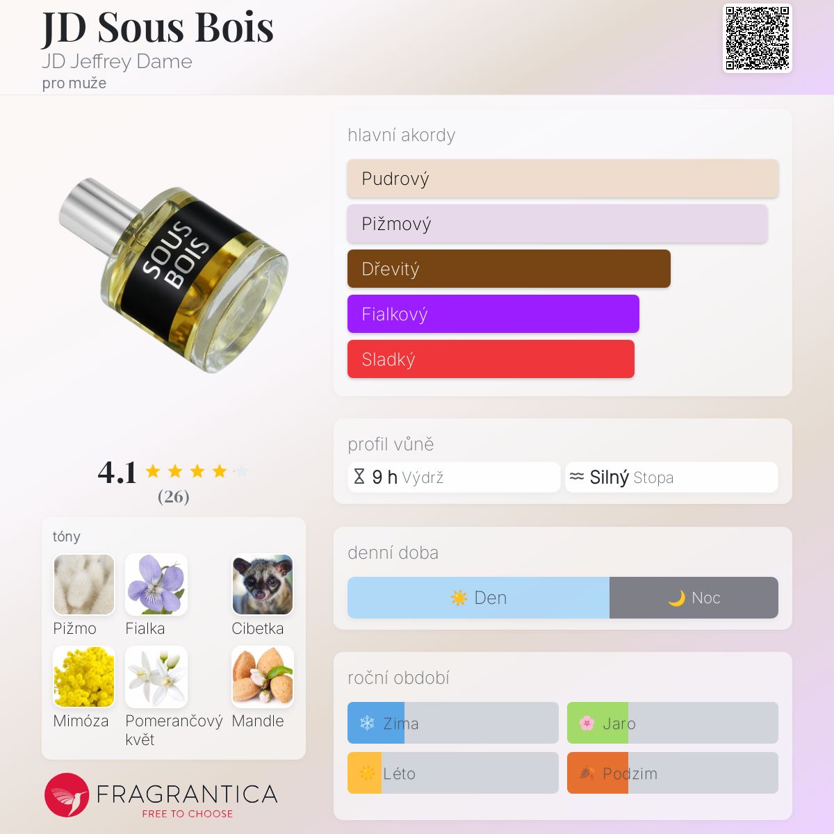 JD Sous Bois podle JD Jeffrey Dame je Woody Chypre vůně pro muže. JD Sous Bois byl/a uveden/a v roce 2018. "Nosem" za touto vůní je Hugh Spencer.