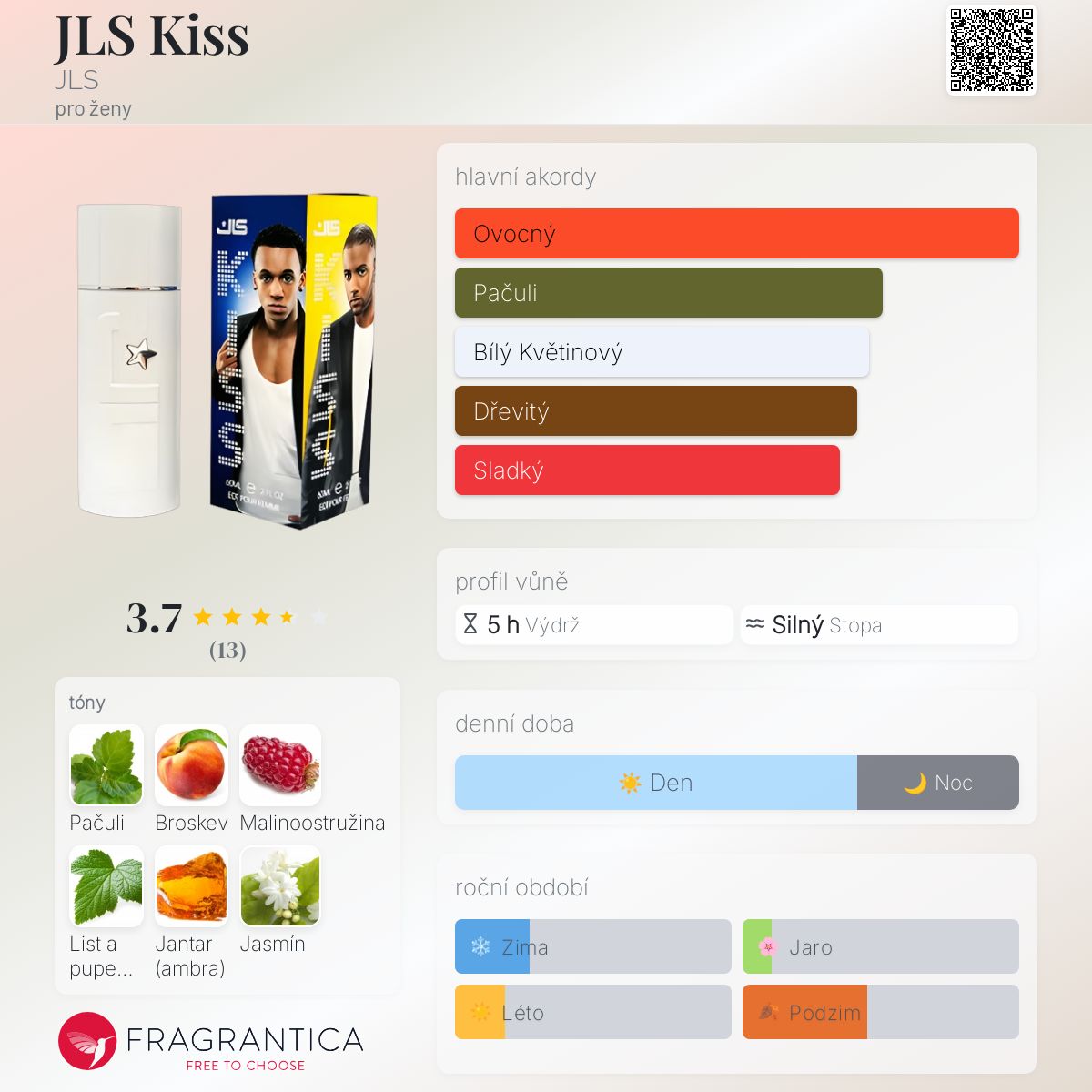 JLS Kiss podle JLS je Orientální Floral vůně pro ženy. JLS Kiss byl/a uveden/a v roce 2012. Vrchní tóny jsou Broskev, Malinoostružina a Černý rybíz; střední tóny jsouJasmín, Neroli, Tuberóza a Černá orchidej ; základní tóny jsou Pačuli, Křišťálový jantar, Bílé pižmo a Dubový mech.