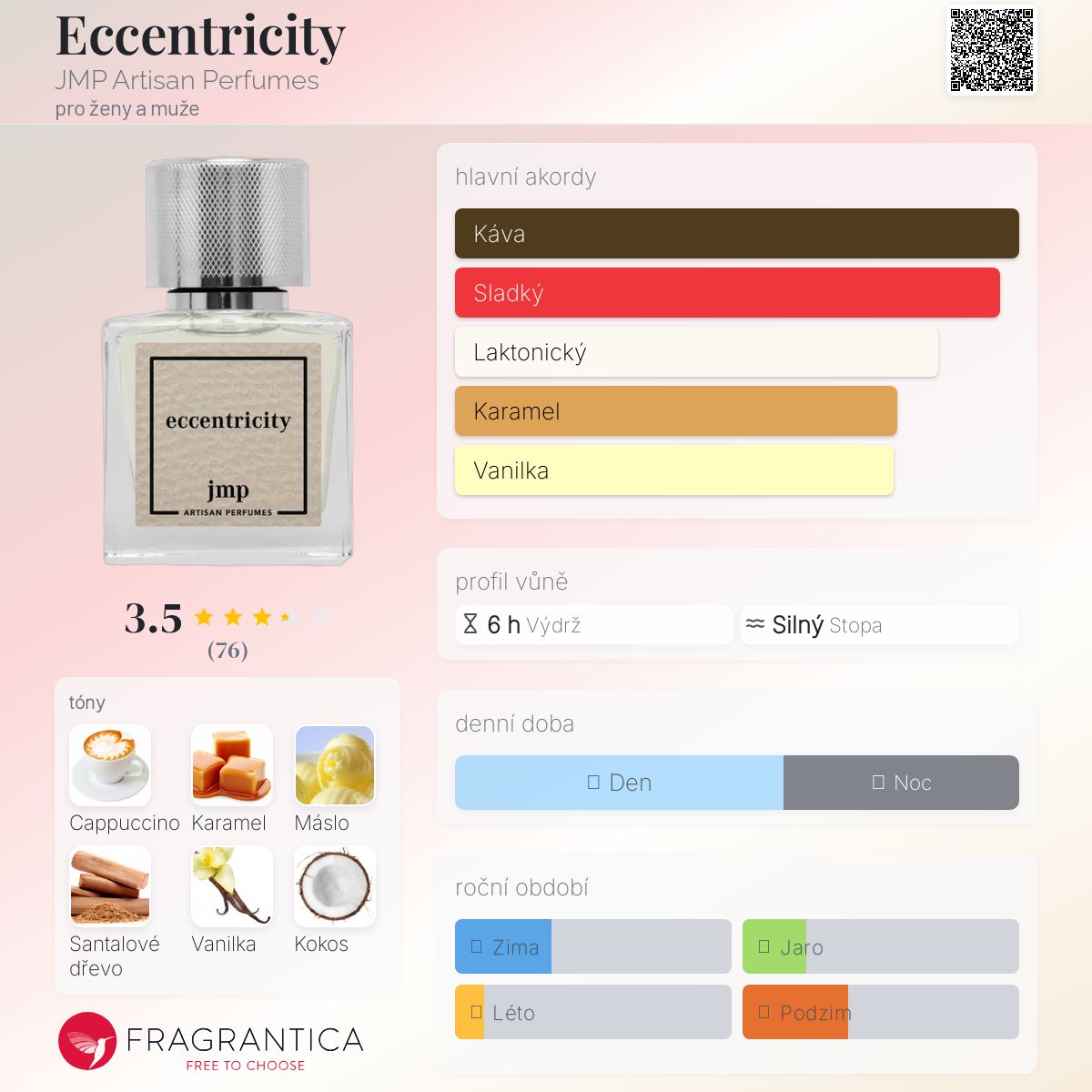 Eccentricity podle JMP Artisan Perfumes je Orientální Vanilla vůně pro ženy a muže. Eccentricity byl/a uveden/a v roce 2020. "Nosem" za touto vůní je Jakub Pietrynka. Vrchní tóny jsou Karamel, Kokos, Třešeň, Růže a Jasmín; střední tóny jsouCappuccino, Máslo, Santalové dřevo, Vanilka a Mandle ; základní tóny jsou Pižmo a Ambra.