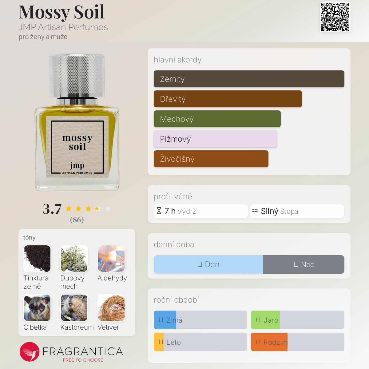 Mossy Soil podle JMP Artisan Perfumes je Chypre vůně pro ženy a muže. Mossy Soil byl/a uveden/a v roce 2019. "Nosem" za touto vůní je Jakub Pietrynka. Vrchní tóny jsou Aldehydy, Bergamot a Citrón; střední tóny jsouPůdní tinktura, Olibanum, Kosatec, Hedione, Růže, Ylang-Ylang a Jasmín Sambac ; základní tóny jsou Dubový mech, Cibetka, Kastoreum, Vetiver, Pačuli, Labdanum, Kůže, Santalové dřevo, Bílé pižmo a Vanilka.