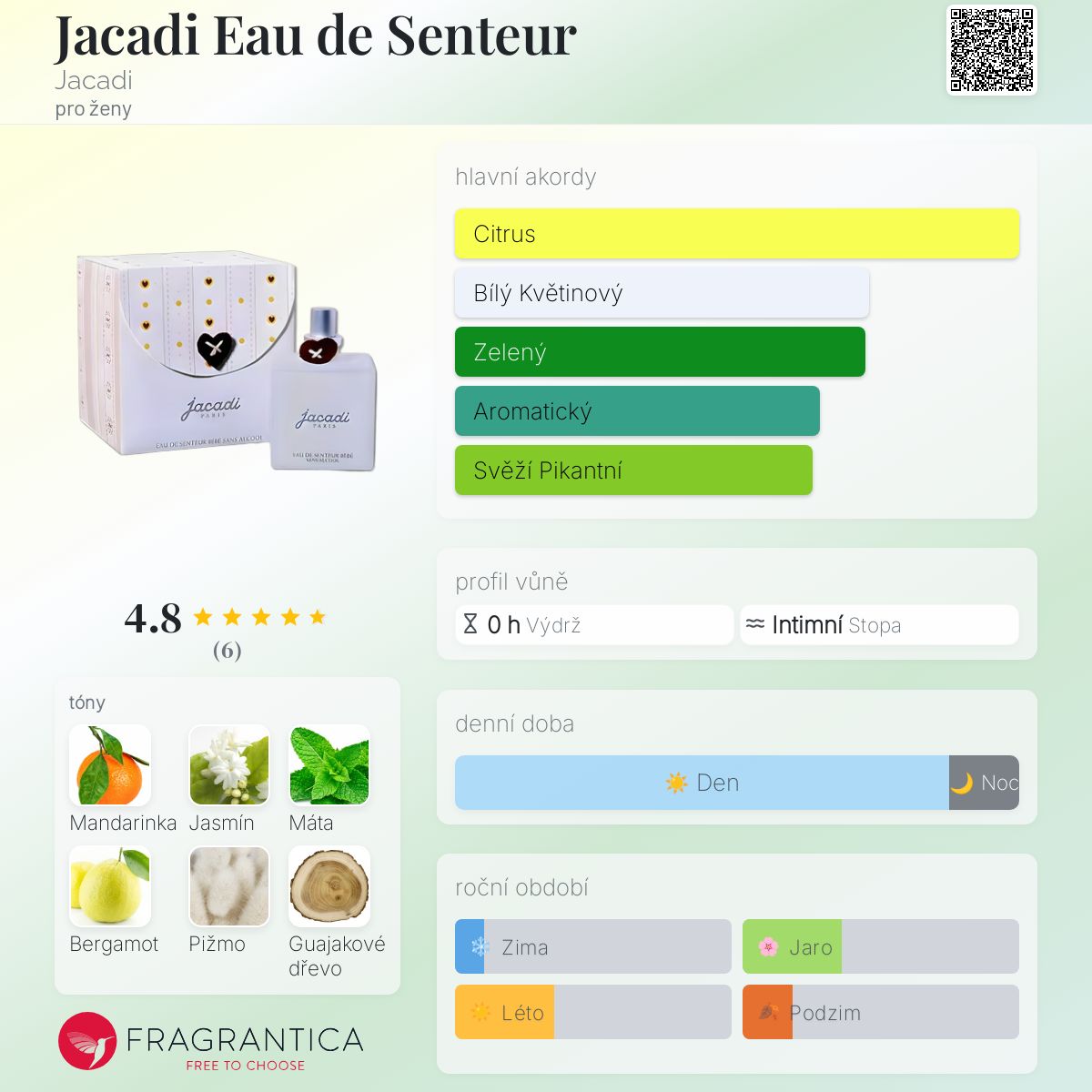 Jacadi Eau de Senteur podle Jacadi je Floral vůně pro ženy. Vrchní tóny jsou Mandarinka, Máta a Bergamot; základní tóny jsou Jasmín, Pižmo a Guajakové dřevo.