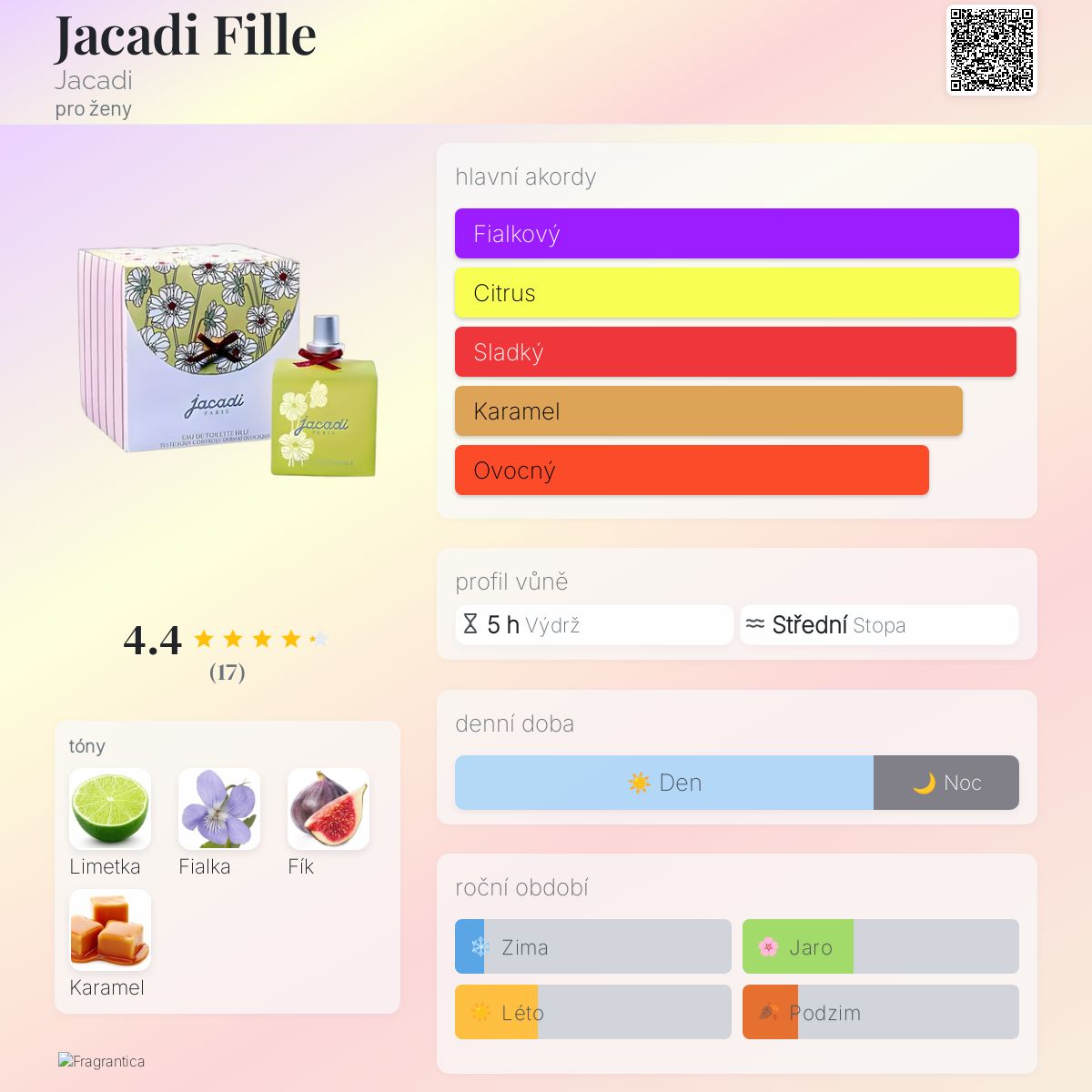 Jacadi Fille podle Jacadi je Floral Fruity vůně pro ženy. Vrchní tón je Limetka ; střední tóny jsouFialka a Fík ; základní tón je Karamel.