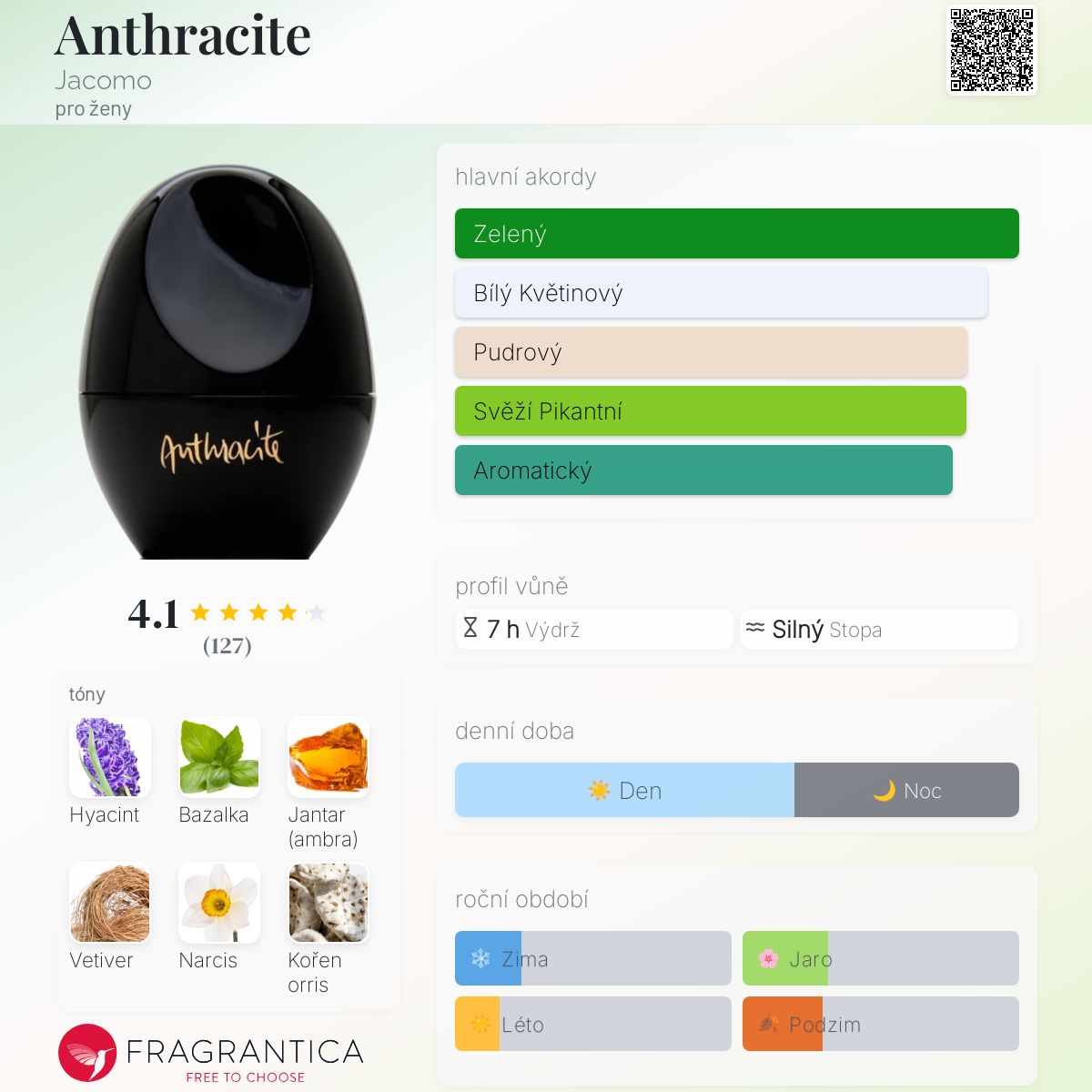 Anthracite podle Jacomo je Orientální Floral vůně pro ženy. Anthracite byl/a uveden/a v roce 1990. Vrchní tóny jsou Hyacint, Bazalka, Bergamot a Citrón; střední tóny jsouNarcis, Kořen kosatce, Pomerančový květ, Tuberóza, Konvalinka, Fialka, Růže a Jasmín ; základní tóny jsou Jantar (ambra), Vetiver, Cedr, Otočník, Benzoin, Pižmo a Vanilka.