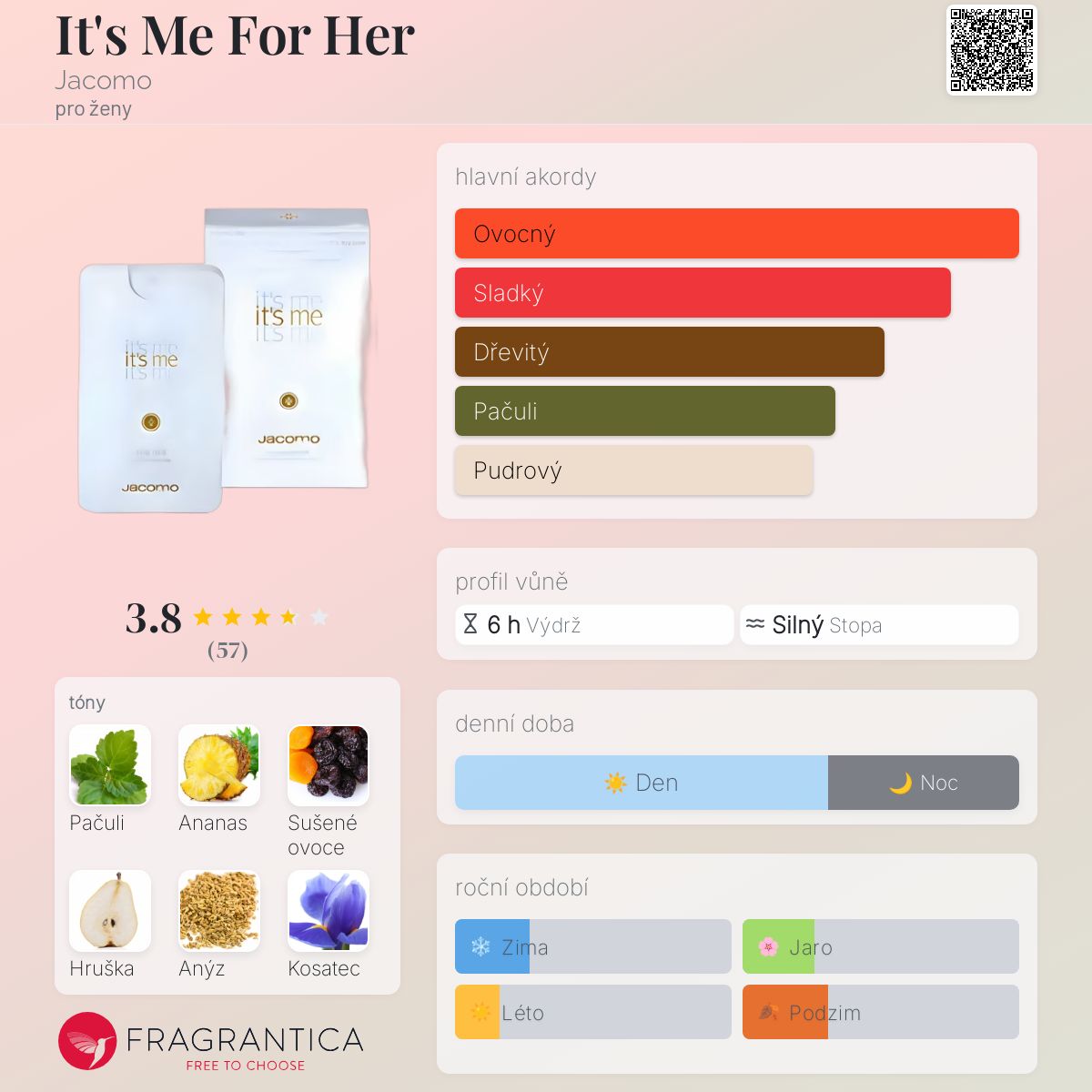 It's Me For Her podle Jacomo je Floral Fruity vůně pro ženy. It's Me For Her byl/a uveden/a v roce 2011. Vrchní tóny jsou Ananas, Anýz a Mandarinka; střední tóny jsouSušené ovoce, Hruška, Frézie a Konvalinka ; základní tóny jsou Pačuli, Kosatec, Pižmo, Jasmín a Santalové dřevo.