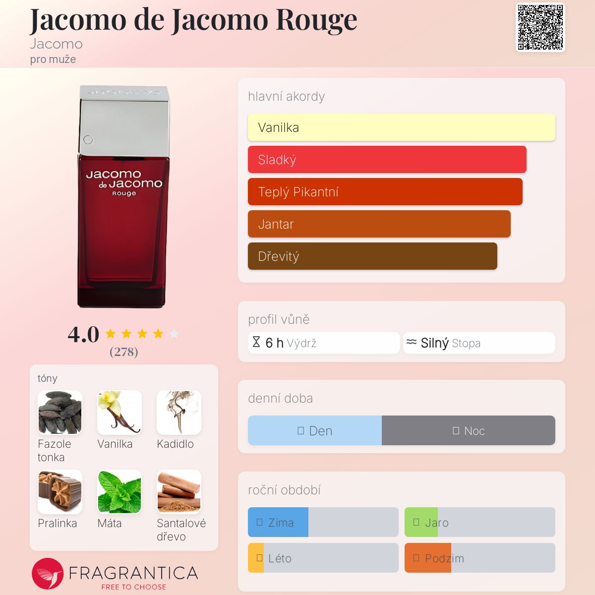 Jacomo de Jacomo Rouge podle Jacomo je Orientální Fougere vůně pro muže. Jacomo de Jacomo Rouge byl/a uveden/a v roce 2002. "Nosem" za touto vůní je Bernard Ellena. Vrchní tóny jsou Máta, Kardamom a Citrón; střední tóny jsouSantalové dřevo, Konvalinka, Cedr a Brambořík ; základní tóny jsou Fazole tonka, Vanilka, Kadidlo, Pralinka, Pačuli a Pižmo.