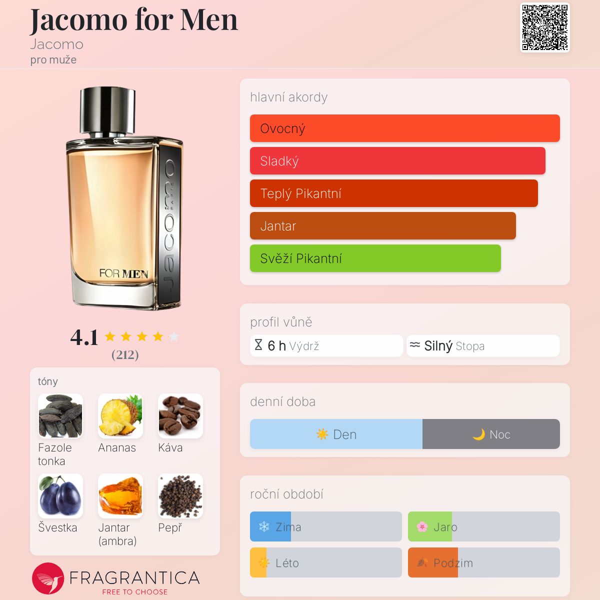 Jacomo for Men podle Jacomo je Orientální Woody vůně pro muže. Jacomo for Men byl/a uveden/a v roce 2007. "Nosem" za touto vůní je Mathilde Bijaoui. Vrchní tóny jsou Ananasový list, Pepř a Cedr; střední tóny jsouKáva, Švestka, Jamajský pepř a Muškátový oříšek ; základní tóny jsou Fazole tonka, Jantar (ambra) a Vetiver.