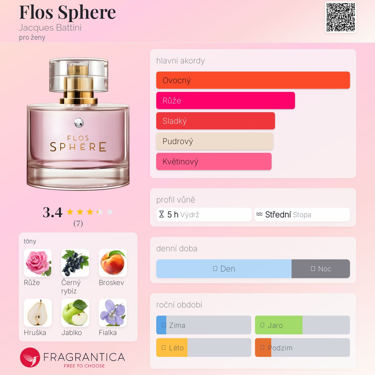Flos Sphere podle Jacques Battini je Floral Fruity vůně pro ženy. Flos Sphere byl/a uveden/a v roce 2016. Vrchní tóny jsou Černý rybíz, Broskev, Hruška, Jablko, Citrón, Bergamot a Ananas; střední tóny jsouRůže, Fialka a Jasmín ; základní tóny jsou Vanilka a Pižmo.