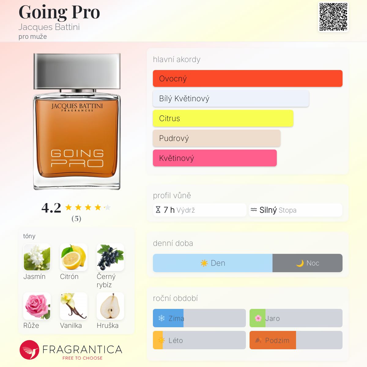 Going Pro podle Jacques Battini je Floral Woody Musk vůně pro muže. Going Pro byl/a uveden/a v roce 2015. Vrchní tóny jsou Citrón, Černý rybíz, Hruška, Jablko a Broskev; střední tóny jsouJasmín, Růže, Pačuli a Fialka ; základní tóny jsou Vanilka, Pižmo a Santalové dřevo.