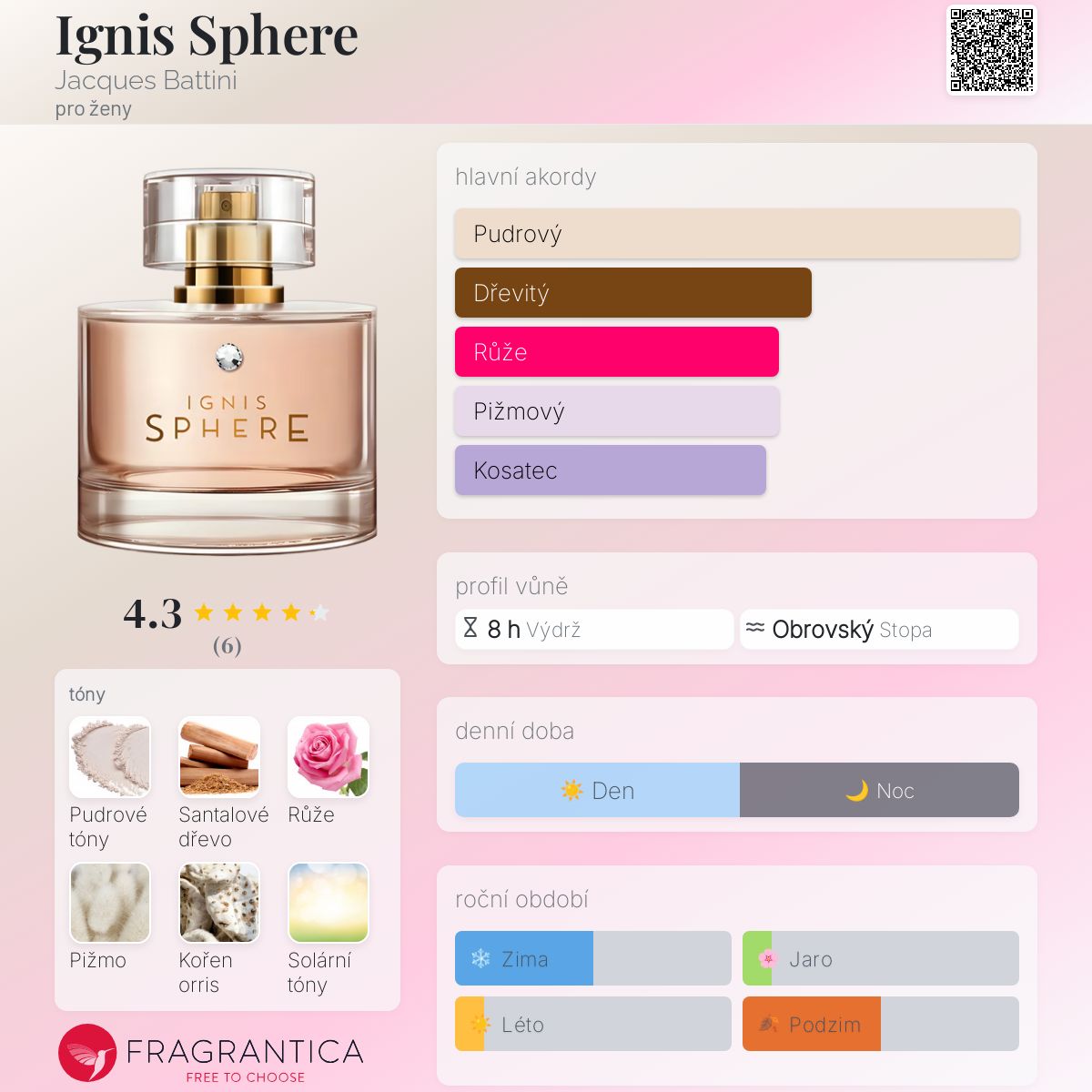 Ignis Sphere podle Jacques Battini je Floral vůně pro ženy. Ignis Sphere byl/a uveden/a v roce 2016. Vrchní tóny jsou Broskev, Bergamot a Citrón; střední tóny jsouRůže, Kořen orris a Jasmín ; základní tóny jsou Pudrové tóny, Santalové dřevo, Pižmo, Solární tóny a Vanilka.