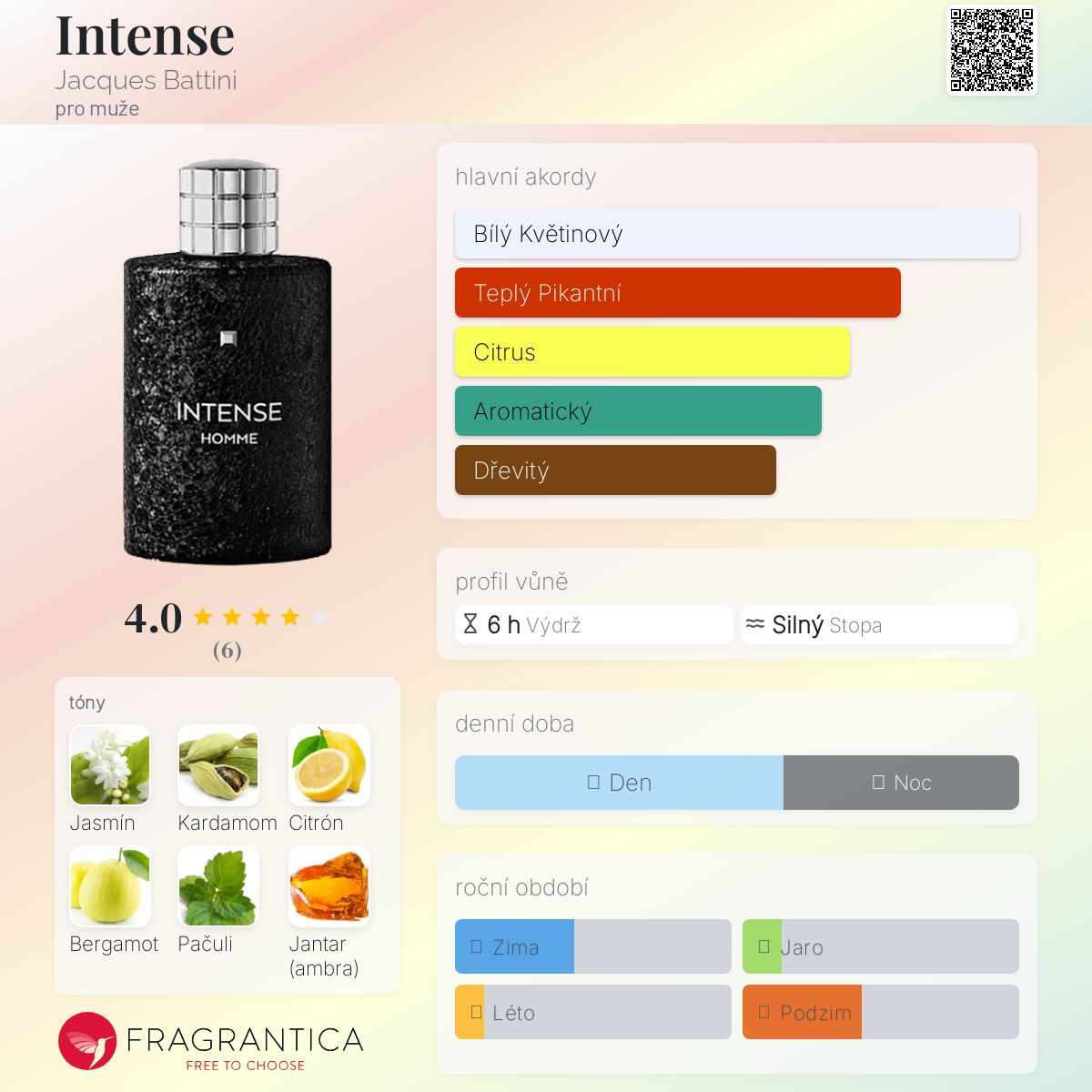 Intense podle Jacques Battini je vůně pro muže. Intense byl/a uveden/a v roce 2018. Vrchní tóny jsou Kardamom, Citrón a Bergamot; střední tóny jsouJasmín a Pačuli ; základní tóny jsou Jantar (ambra), Santalové dřevo a Vanilka.