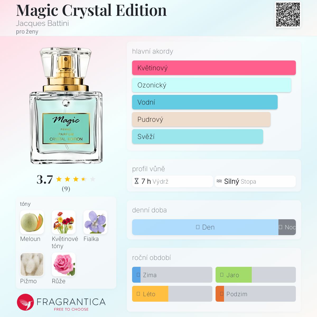 Magic Crystal Edition podle Jacques Battini je Floral vůně pro ženy. Magic Crystal Edition byl/a uveden/a v roce 2012. Vrchní tóny jsou Meloun a Fialka; střední tóny jsouKvětinové tóny a Růže ; základní tón je Pižmo.