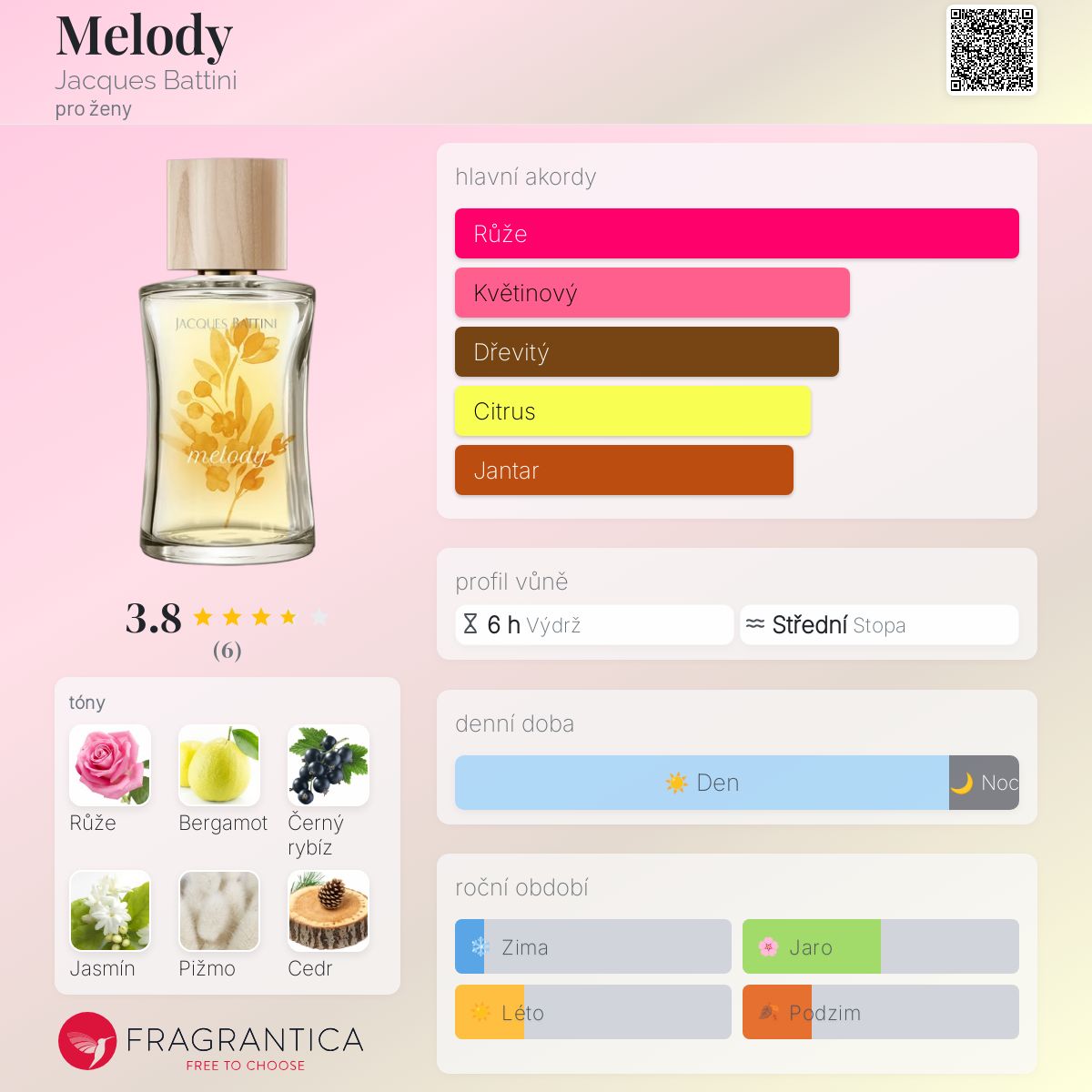 Melody podle Jacques Battini je vůně pro ženy. Melody byl/a uveden/a v roce 2019. Vrchní tóny jsou Růže a Bergamot; střední tóny jsouČerný rybíz a Jasmín ; základní tóny jsou Pižmo, Cedr a Jantar (ambra).