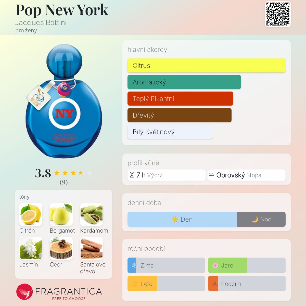 Pop New York podle Jacques Battini je Floral Woody Musk vůně pro ženy. Pop New York byl/a uveden/a v roce 2014. Vrchní tóny jsou Citrón, Bergamot a Červené bobule; střední tóny jsouKardamom a Jasmín ; základní tóny jsou Cedr, Santalové dřevo a Pižmo.