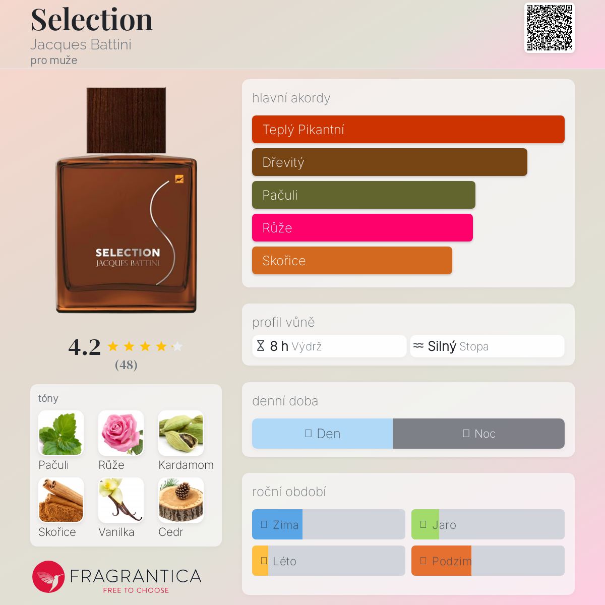 Selection podle Jacques Battini je vůně pro muže. Selection byl/a uveden/a v roce 2018. Vrchní tóny jsou Kardamom, Skořice, Grapefruit, Bergamot a Pelargónie; střední tóny jsouPačuli, Růže a Jasmín ; základní tóny jsou Vanilka, Cedr, Bílé pižmo a Guajakové dřevo.