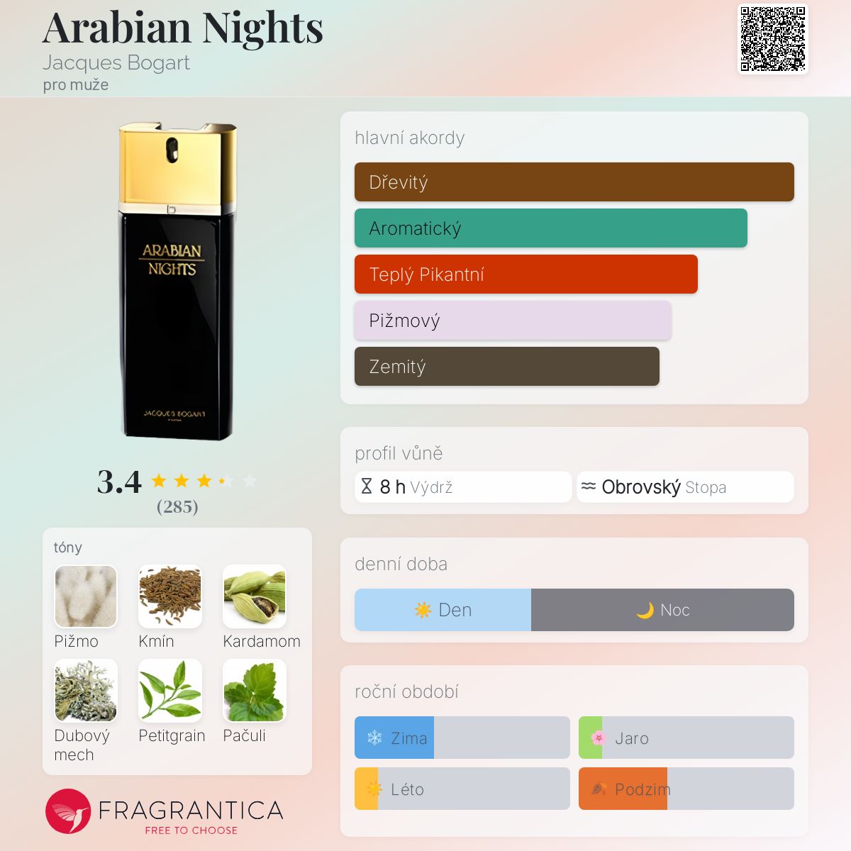 Arabian Nights podle Jacques Bogart je Orientální Fougere vůně pro muže. Arabian Nights byl/a uveden/a v roce 2010. Vrchní tóny jsou Kmín, Kardamom a Petitgrain; střední tóny jsouPačuli a Dřevité tóny ; základní tóny jsou Pižmo, Dubový mech, Vetiver a Virginský cedr.