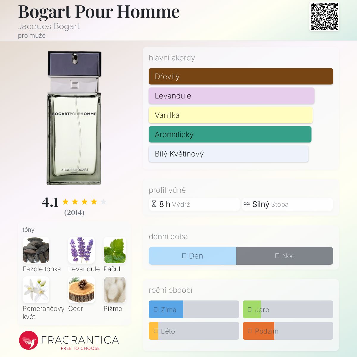 Bogart Pour Homme podle Jacques Bogart je vůně pro muže. Bogart Pour Homme byl/a uveden/a v roce 2004. Bogart Pour Homme byl/a vytvořen/a Maurice Roucel a Norbert Bijaoui. Vrchní tóny jsou Levandule a Bergamot; střední tóny jsouPomerančový květ, Růže a Konvalinka ; základní tóny jsou Fazole tonka, Pačuli, Cedr, Pižmo a Dubový mech.