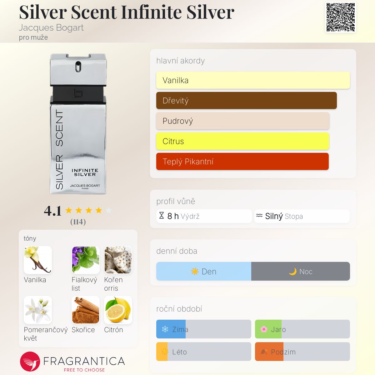 Silver Scent Infinite Silver podle Jacques Bogart je Orientální Fougere vůně pro muže. Silver Scent Infinite Silver byl/a uveden/a v roce 2021. Vrchní tóny jsou Fialkový list, Skořice a Citrón; střední tóny jsouOrris, Pomerančový květ, Levandule a Pelargónie ; základní tóny jsou Vanilka, Labdanum, Cedr a Pačuli.