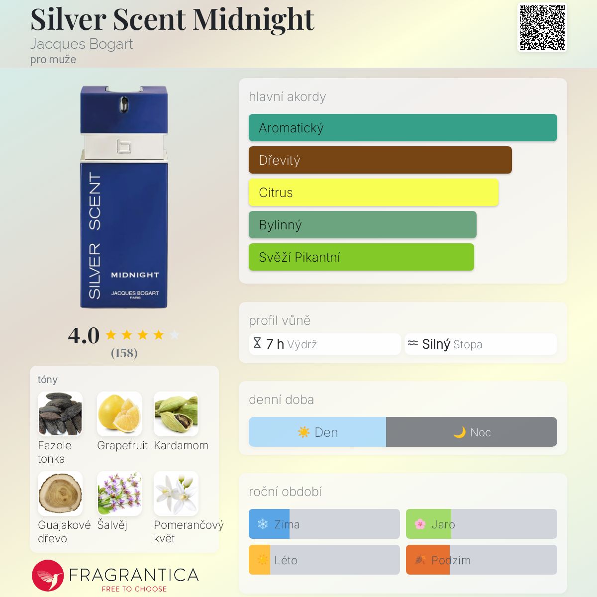 Silver Scent Midnight podle Jacques Bogart je Aromatic vůně pro muže. Silver Scent Midnight byl/a uveden/a v roce 2017. Vrchní tóny jsou Grapefruit, Kardamom a Šalvěj; střední tóny jsouPomerančový květ, Muškátový oříšek a Pelyněk ; základní tóny jsou Fazole tonka, Guajakové dřevo a Cedr.