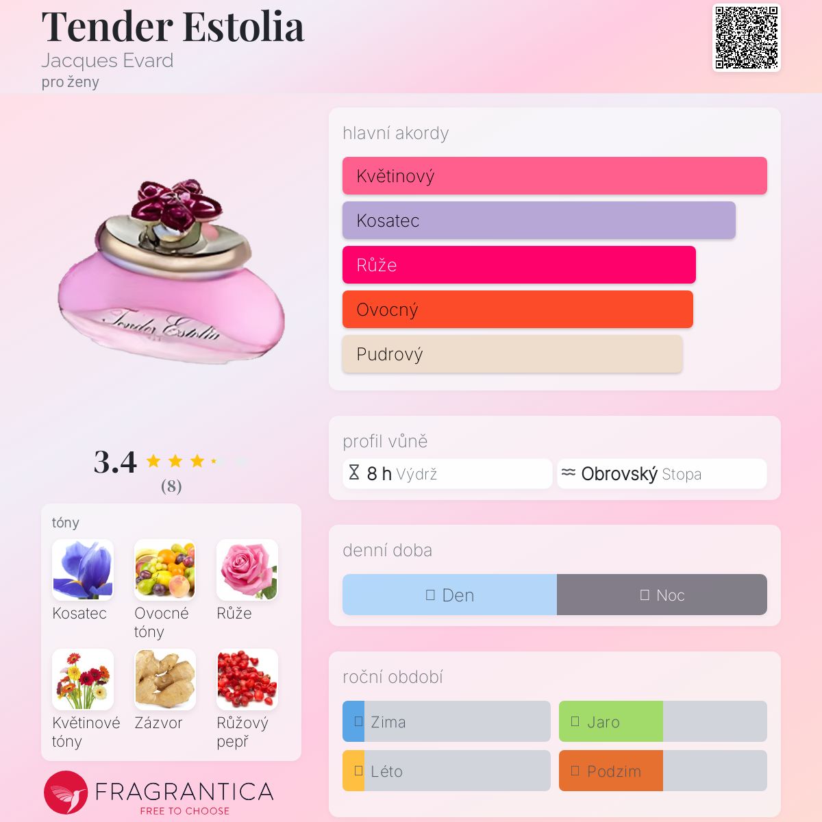 Tender Estolia podle Jacques Evard je Floral vůně pro ženy. Vrchní tóny jsou Ovocné a kořeněné tóny, Květinové tóny, Zázvor a Růžový pepř; střední tóny jsouKosatec, Růže a Magnólie ; základní tóny jsou Kadidlo, Pižmo a Vanilka.