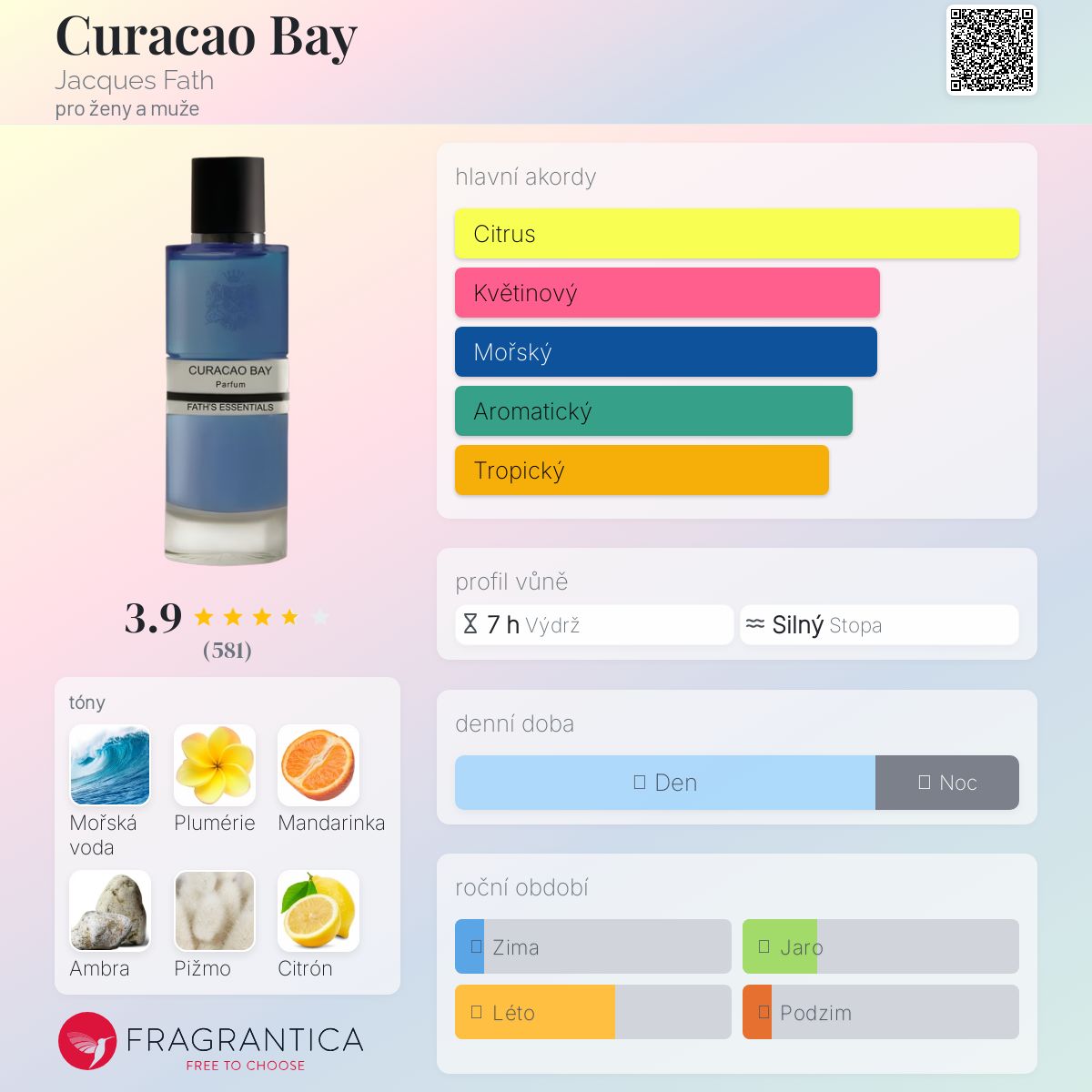Curacao Bay podle Jacques Fath je vůně pro ženy a muže. Curacao Bay byl/a uveden/a v roce 2015. "Nosem" za touto vůní je Cécile Zarokian. Vrchní tóny jsou Mandarinka, Citrón, Pomeranč, Petitgrain a Zelené tóny; střední tóny jsouMořské tóny, Plumérie a Černý rybíz ; základní tóny jsou Ambra, Bílé pižmo a Dřevité tóny.
