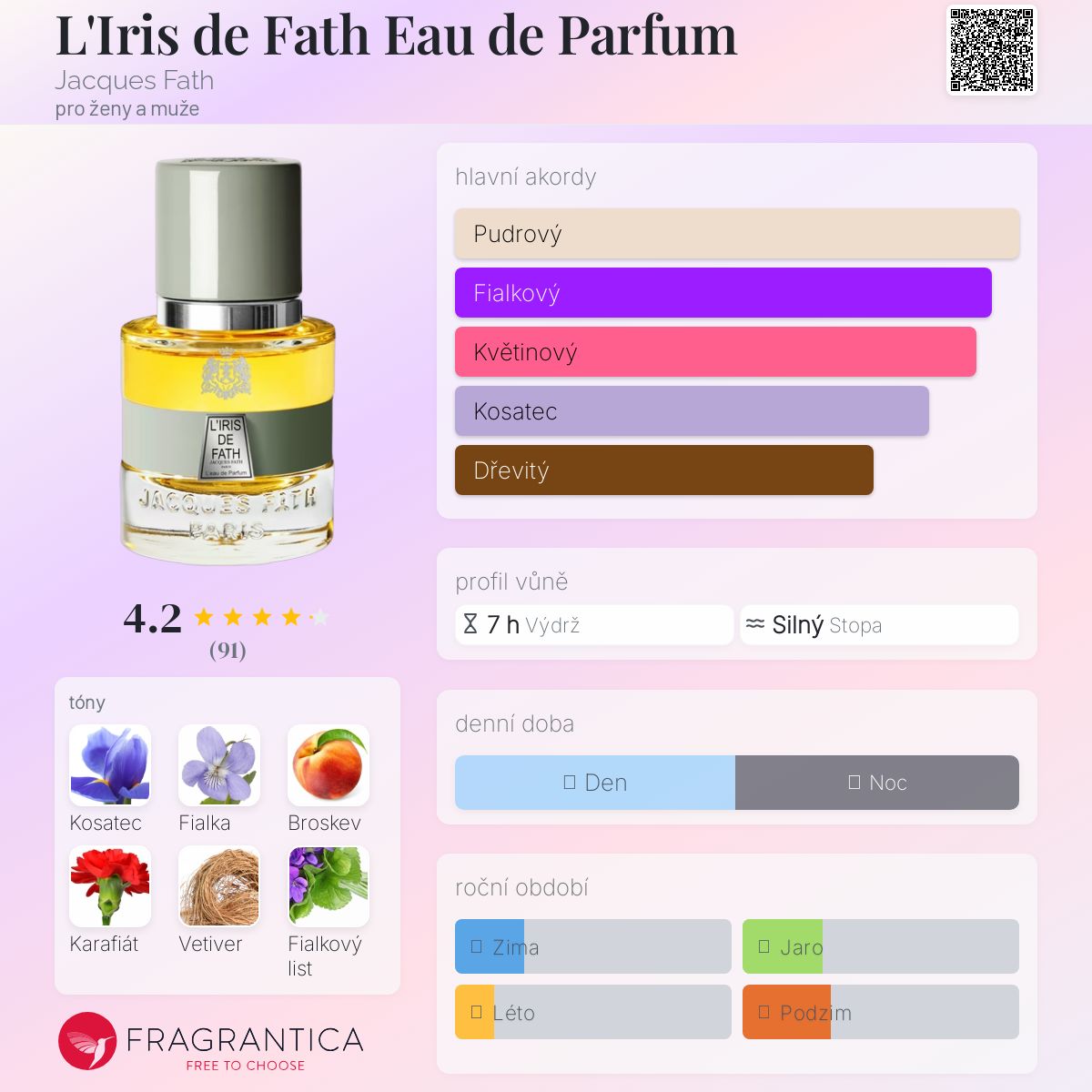 L'Iris de Fath Eau de Parfum podle Jacques Fath je Floral vůně pro ženy a muže. L'Iris de Fath Eau de Parfum byl/a uveden/a v roce 2023. "Nosem" za touto vůní je Patrice Revillard. Vrchní tóny jsou Broskev, Fialkový list a Bergamot; střední tóny jsouKosatec, Fialka, Karafiát, Jasmín, Ylang-Ylang, Turecká růže a Šeřík ; základní tóny jsou Bourbonský vetiver, Pižmo, Benzoin a Fazole tonka.