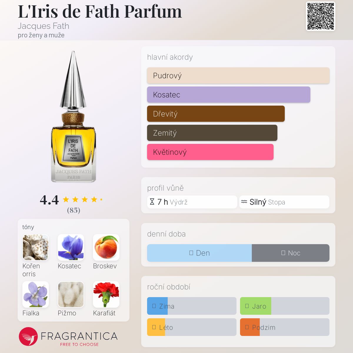 L'Iris de Fath Parfum podle Jacques Fath je Floral vůně pro ženy a muže. L'Iris de Fath Parfum byl/a uveden/a v roce 2018. "Nosem" za touto vůní je Patrice Revillard. Vrchní tóny jsou Broskev, Petitgrain, Bergamot a Neroli; střední tóny jsouKořen orris, Kosatec, Fialka, Karafiát, Fialkový list, Jasmín a Turecká růže ; základní tóny jsou Pižmo, Dubový mech, Santalové dřevo a Bourbonský vetiver.