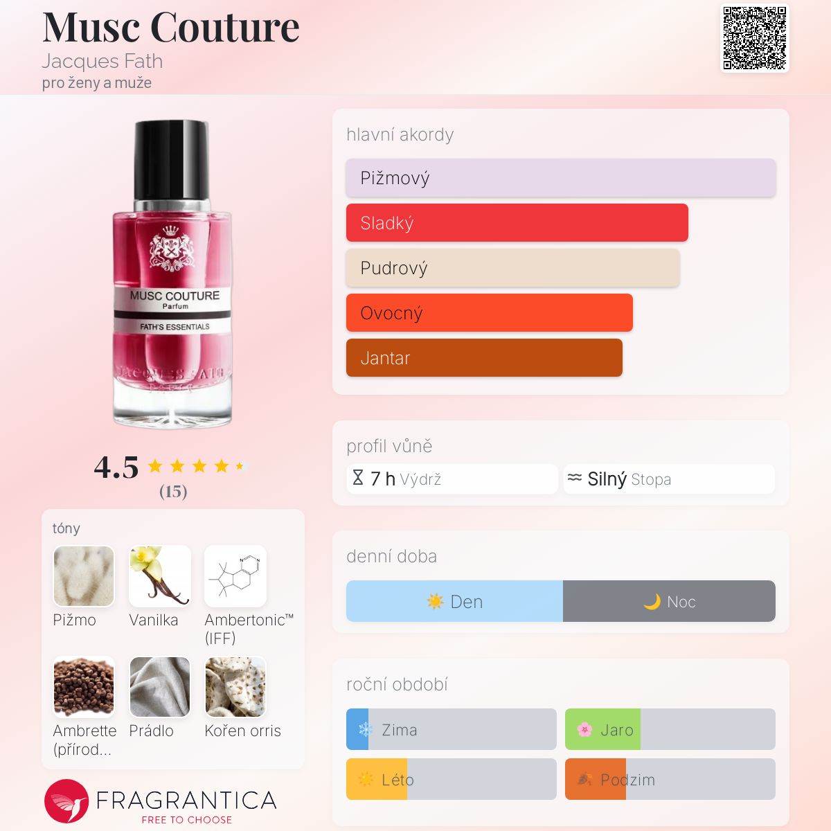 Musc Couture podle Jacques Fath je Floral Fruity vůně pro ženy a muže. Toto je nová vůně. Musc Couture byl/a uveden/a v roce 2025. "Nosem" za touto vůní je Jean-Christophe Hérault. Vrchní tóny jsou Třešeň, Banán a Bergamot; střední tóny jsouPrádlo a Orris ; základní tóny jsou Pižmo, Ambertonic, Vanilkový lusk, Ambrette (přírodní pižmo), Léčivé dřevo, Maliny a Vetiver.