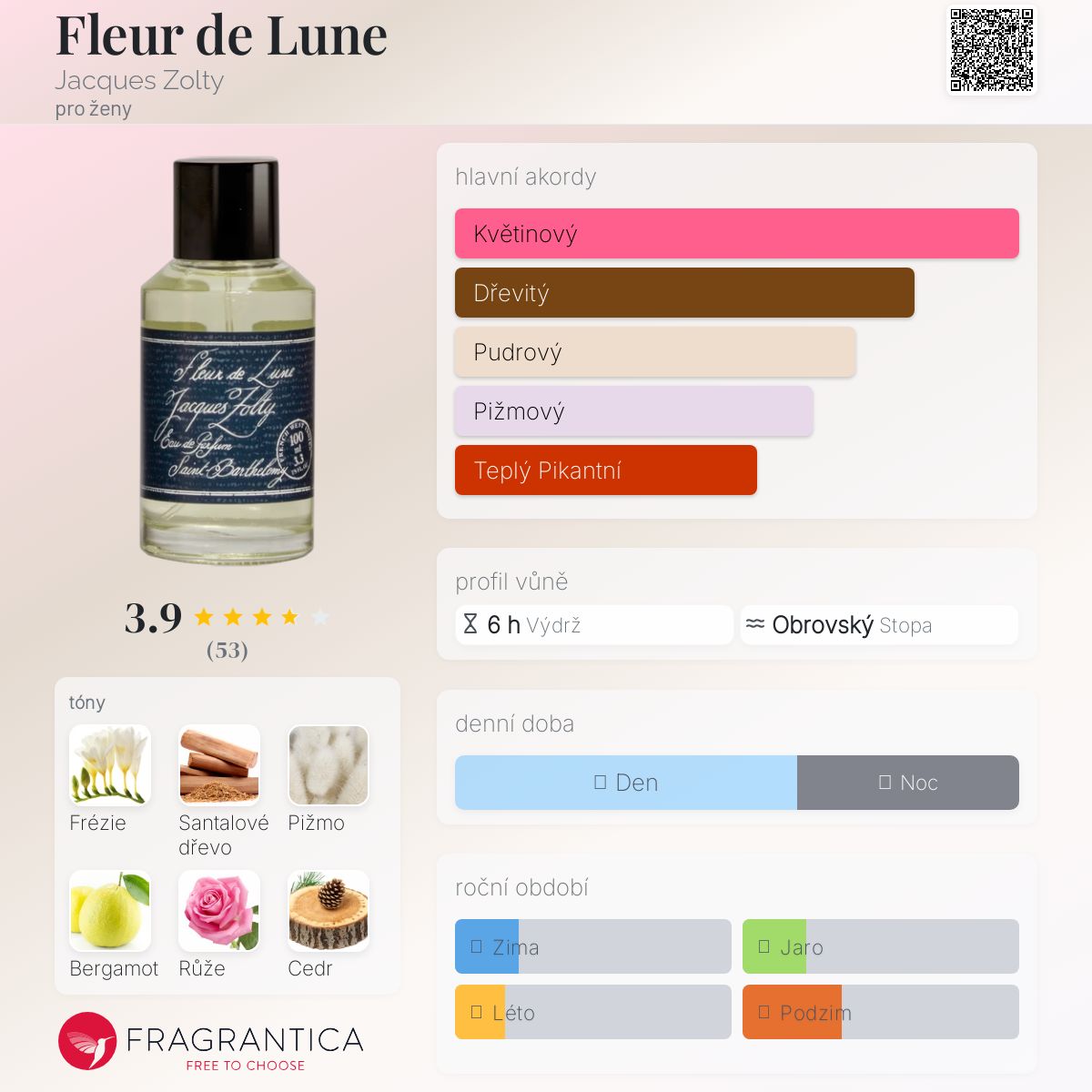 Fleur de Lune podle Jacques Zolty je Floral Woody Musk vůně pro ženy. Fleur de Lune byl/a uveden/a v roce 2014. "Nosem" za touto vůní je David Maruitte.