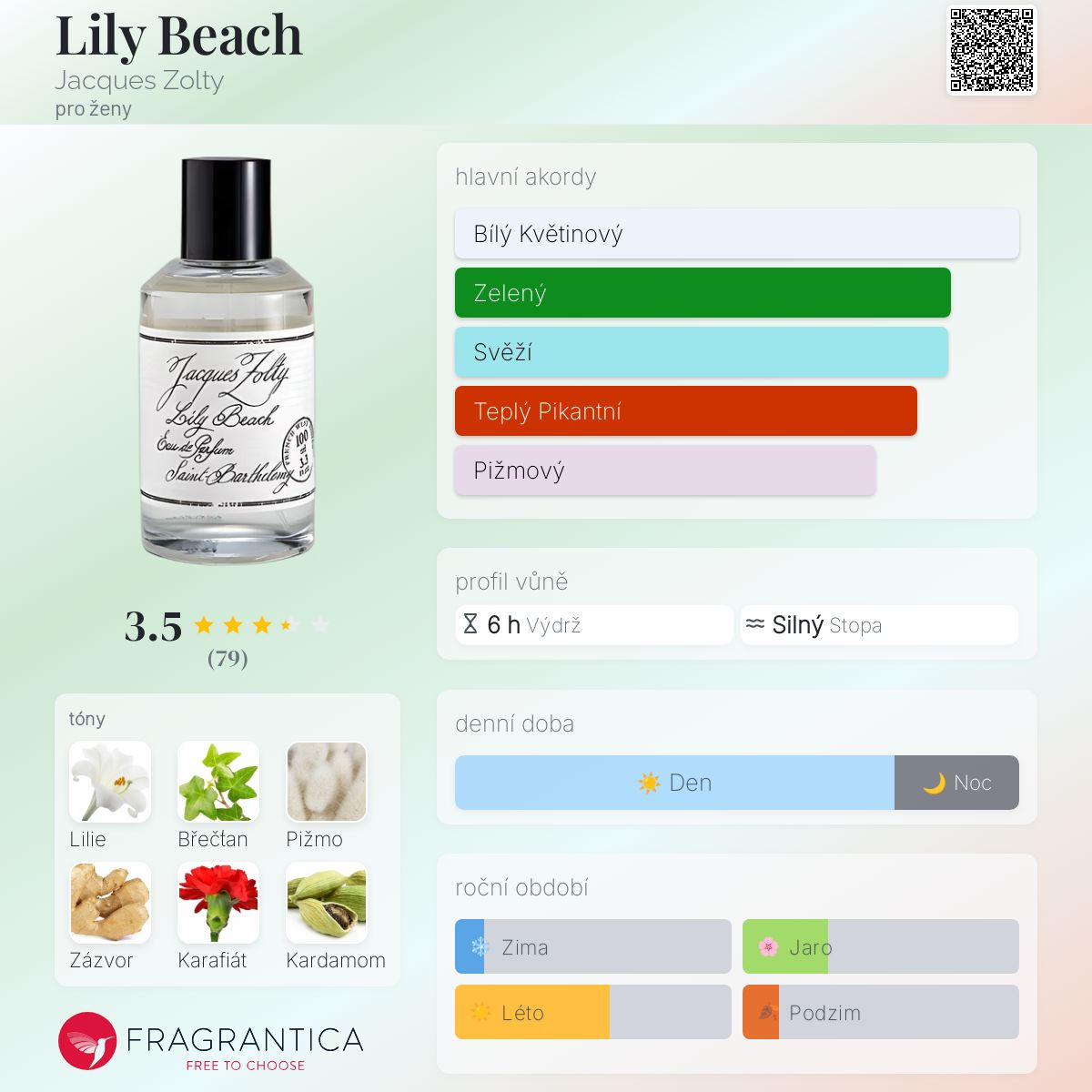 Lily Beach podle Jacques Zolty je Floral Woody Musk vůně pro ženy. Lily Beach byl/a uveden/a v roce 2009. Vrchní tóny jsou Břečťan, Zázvor, Karafiát a Kardamom; střední tón jeLilie ; základní tóny jsou Pižmo a Cedr.
