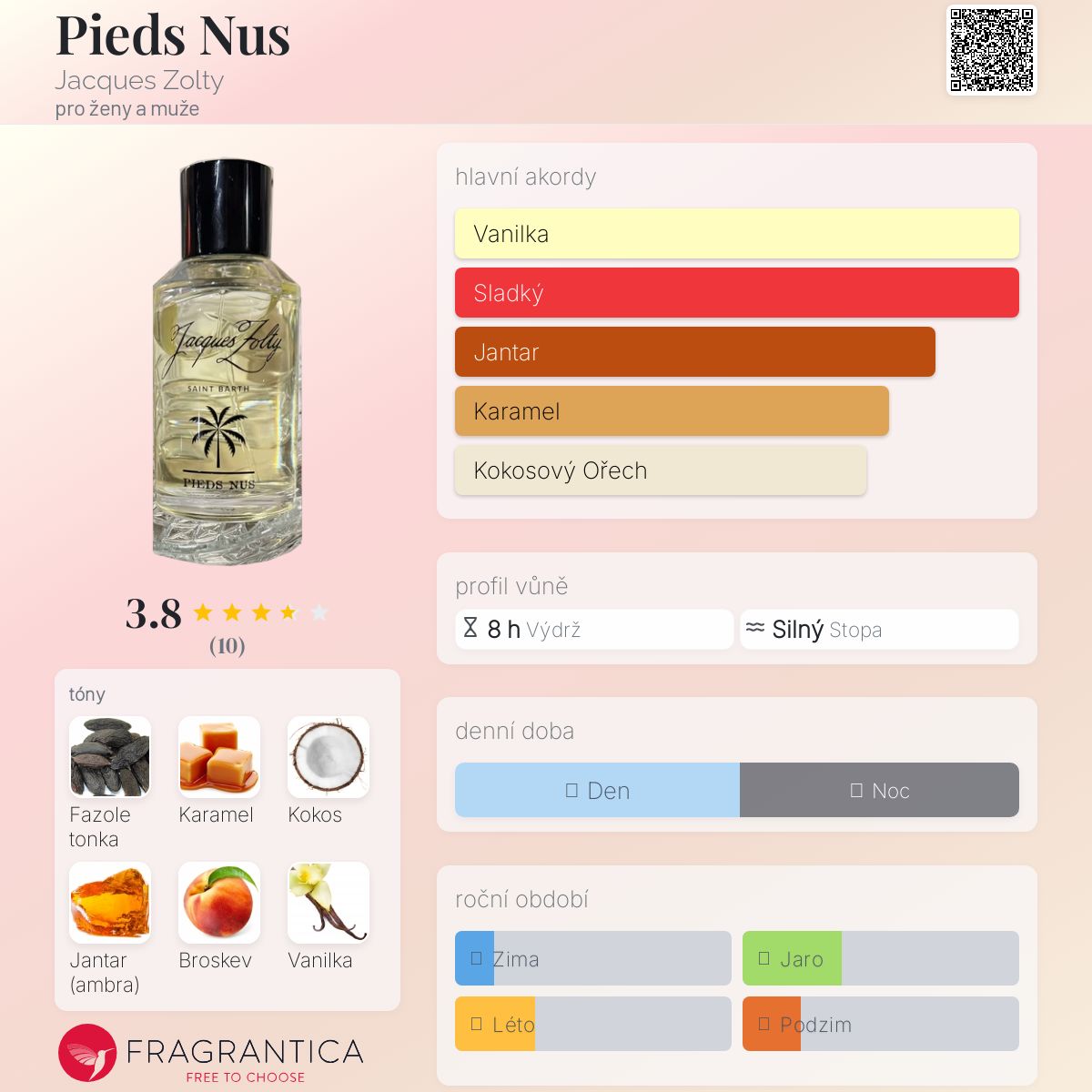 Pieds Nus podle Jacques Zolty je vůně pro ženy a muže. Toto je nová vůně. Pieds Nus byl/a uveden/a v roce 2025. Vrchní tóny jsou Kokos, Broskev, Pomeranč, Zázvor, Jablko a Bergamot; střední tóny jsouKaramel, Kosatec, Santalové dřevo, Pačuli, Egyptský jasmín a Růže ; základní tóny jsou Fazole tonka, Jantar (ambra), Vanilka, Pižmo a Mech.