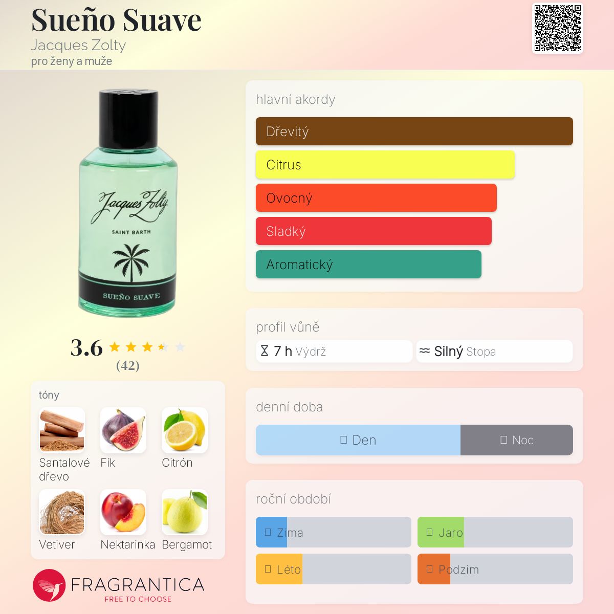 Sueño Suave podle Jacques Zolty je Floral Fruity Gourmand vůně pro ženy a muže. Sueño Suave byl/a uveden/a v roce 2022. Vrchní tóny jsou Fík, Citrón, Nektarinka, Bergamot, Mandarinka a Broskev; střední tóny jsouČerný pepř, Kardamom, Muškátový oříšek, Koriandr a Damašská růže ; základní tóny jsou Santalové dřevo, Vetiver, Cukr, Cedr, Pačuli, Fazole tonka a Jantar (ambra).