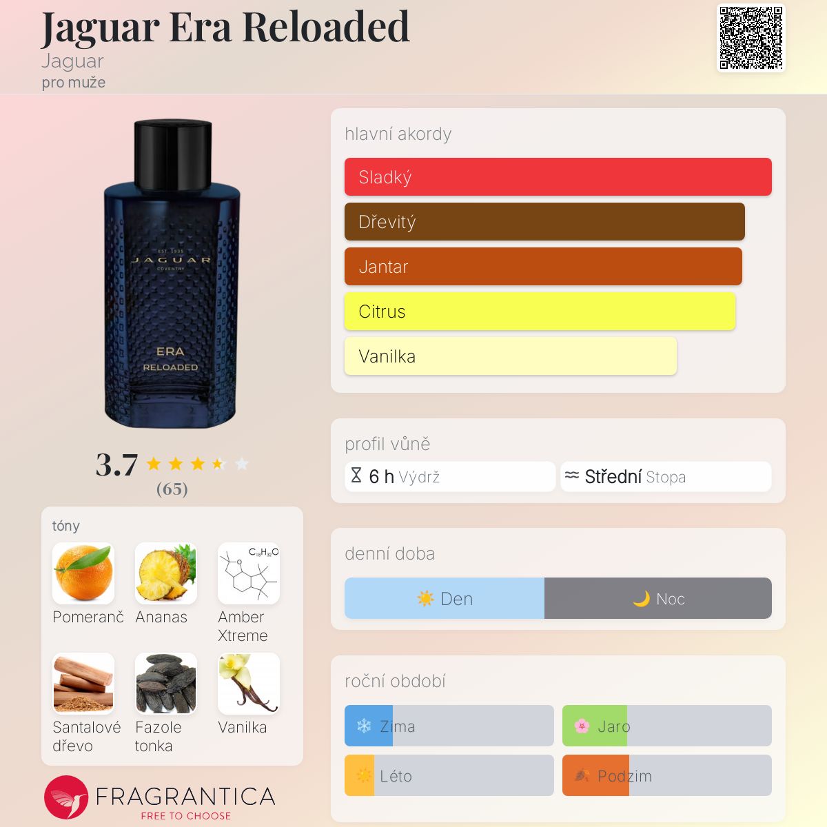 Jaguar Era Reloaded podle Jaguar je vůně pro muže. Toto je nová vůně. Jaguar Era Reloaded byl/a uveden/a v roce 2024. Vrchní tóny jsou Brazilský pomeranč a Sicilský citron; střední tóny jsouRůžový pepř, Ananas, Muškátový oříšek, Jasmín, Jablko, Meloun a Pikantní máta ; základní tóny jsou Amber Xtreme, Santalové dřevo, Fazole tonka, Vanilka, Karamel, Pižmo, Cedr, Jantar (ambra), Labdanum a Pačuli.