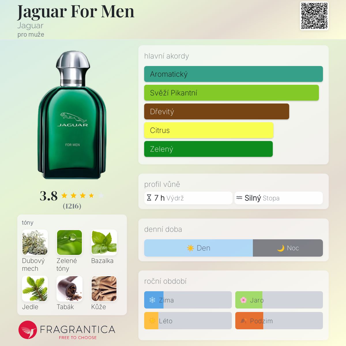 Jaguar For Men podle Jaguar je Aromatic vůně pro muže. Jaguar For Men byl/a uveden/a v roce 1988. "Nosem" za touto vůní je Dominique Preyssas. Vrchní tóny jsou Zelené tóny, Bazalka, Pomeranč, Grapefruit, Levandule, Kasie, Mandarinka, Bergamot, Tymián a Anýz; střední tóny jsouJedle, Karafiát, Muškátový oříšek, Šalvěj, Skořice, Kmín, Pelargónie, Brambořík, Gardénie, Růže a Jasmín ; základní tóny jsou Dubový mech, Tabák, Kůže, Kapradina, Cedr, Pačuli, Santalové dřevo, Pižmo, Jantar (ambra), Fazole tonka a Vanilka.