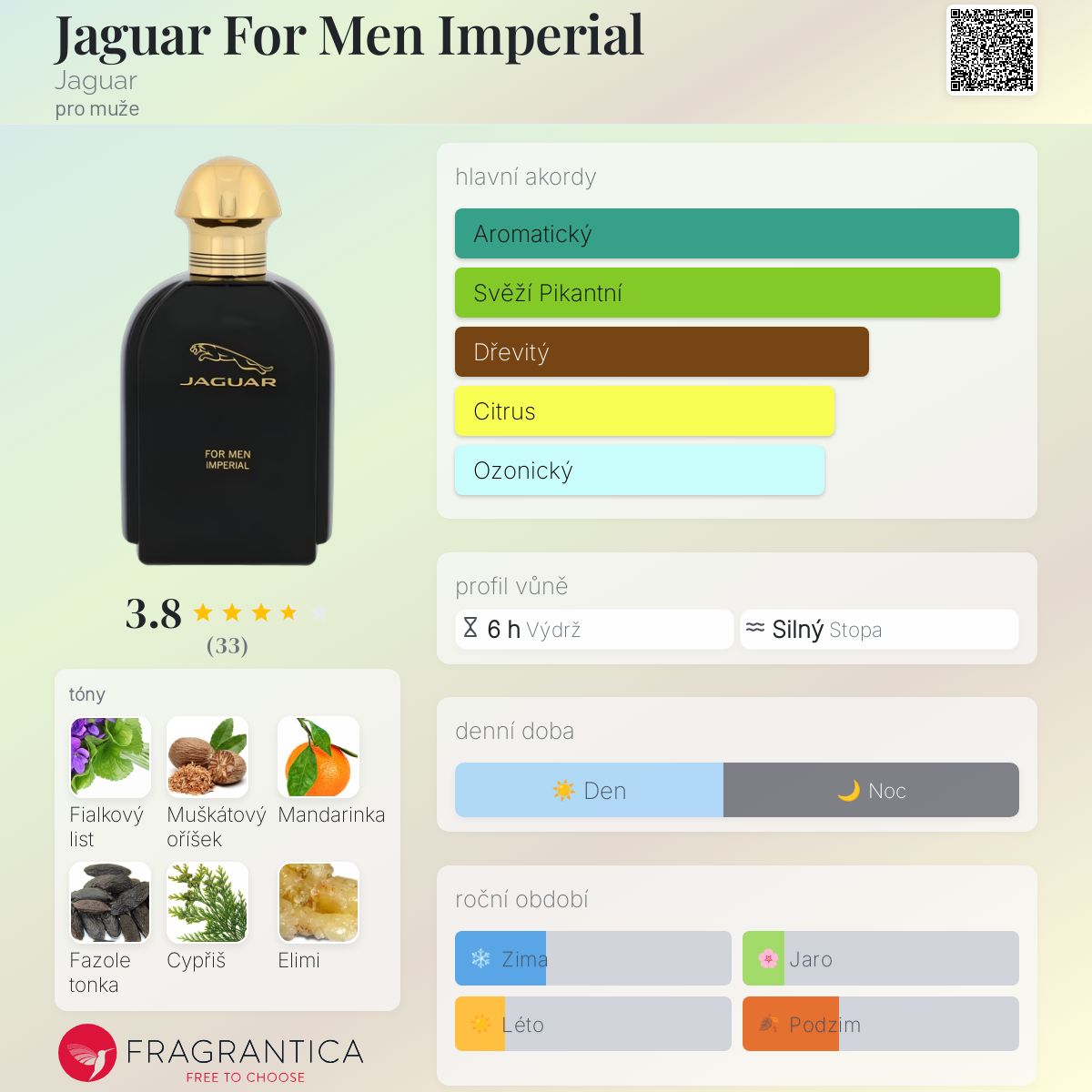 Jaguar For Men Imperial podle Jaguar je Woody Spicy vůně pro muže. Jaguar For Men Imperial byl/a uveden/a v roce 2015. Vrchní tóny jsou Italská mandarinka, Pryskyřice elemi a Pelyněk; střední tóny jsouFialkový list, Muškátový oříšek a Zázvor ; základní tóny jsou Fazole tonka, Cypřiš a Vetiver.