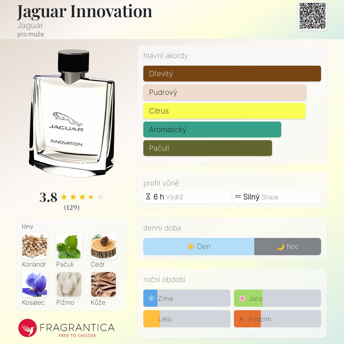 Jaguar Innovation podle Jaguar je Orientální Woody vůně pro muže. Jaguar Innovation byl/a uveden/a v roce 2014. "Nosem" za touto vůní je Michel Almairac. Vrchní tóny jsou Koriandr, Mandarinka a Bergamot; střední tóny jsouPačuli, Cedr a Kosatec ; základní tóny jsou Pižmo, Kůže a Vanilka.