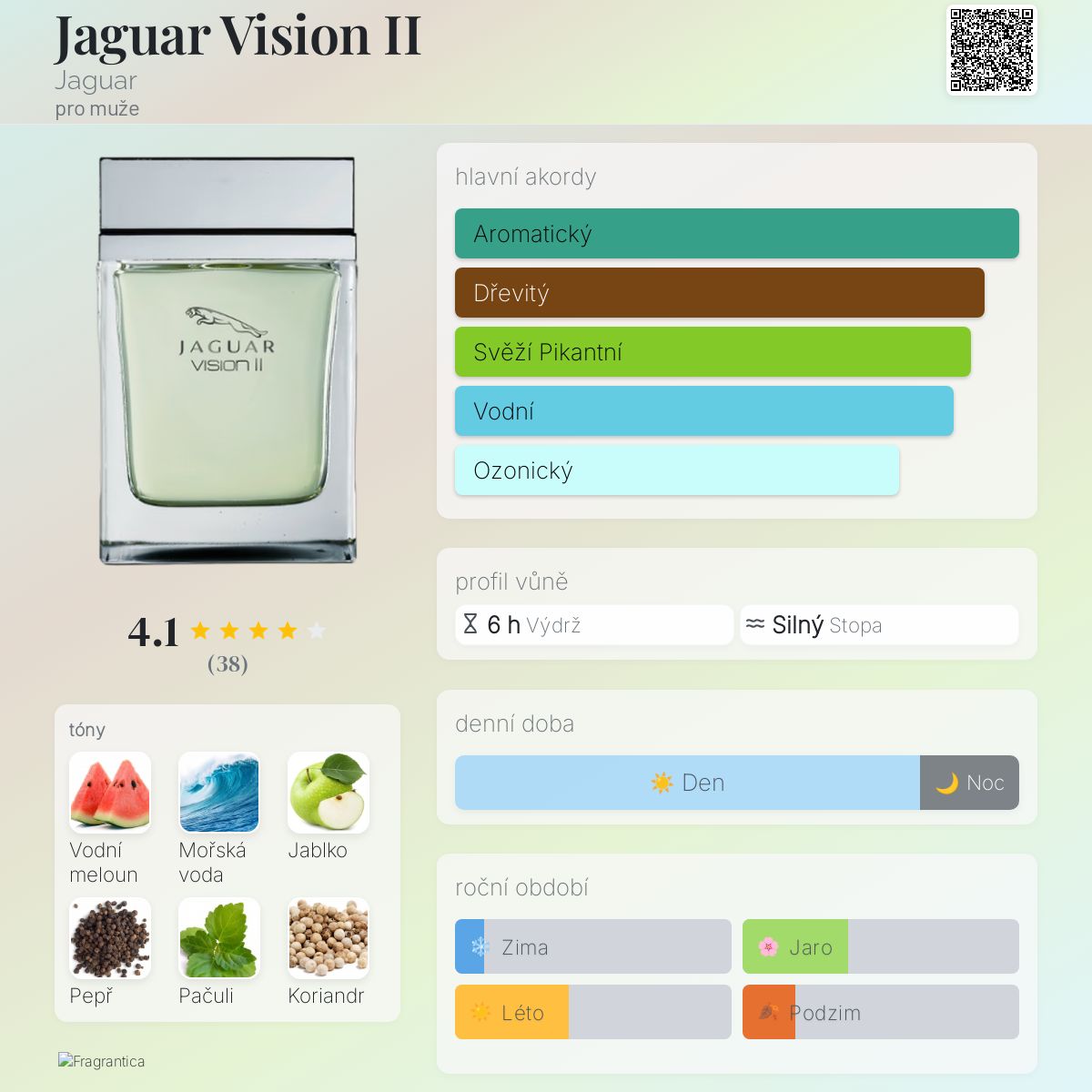 Jaguar Vision II podle Jaguar je Aromatic vůně pro muže. Jaguar Vision II byl/a uveden/a v roce 2018. Vrchní tóny jsou Vodní meloun, Zelené jablko a Koriandr; střední tóny jsouMořské tóny, Bílý pepř a Pelargónie ; základní tóny jsou Pačuli, Cedr a Lorenox.