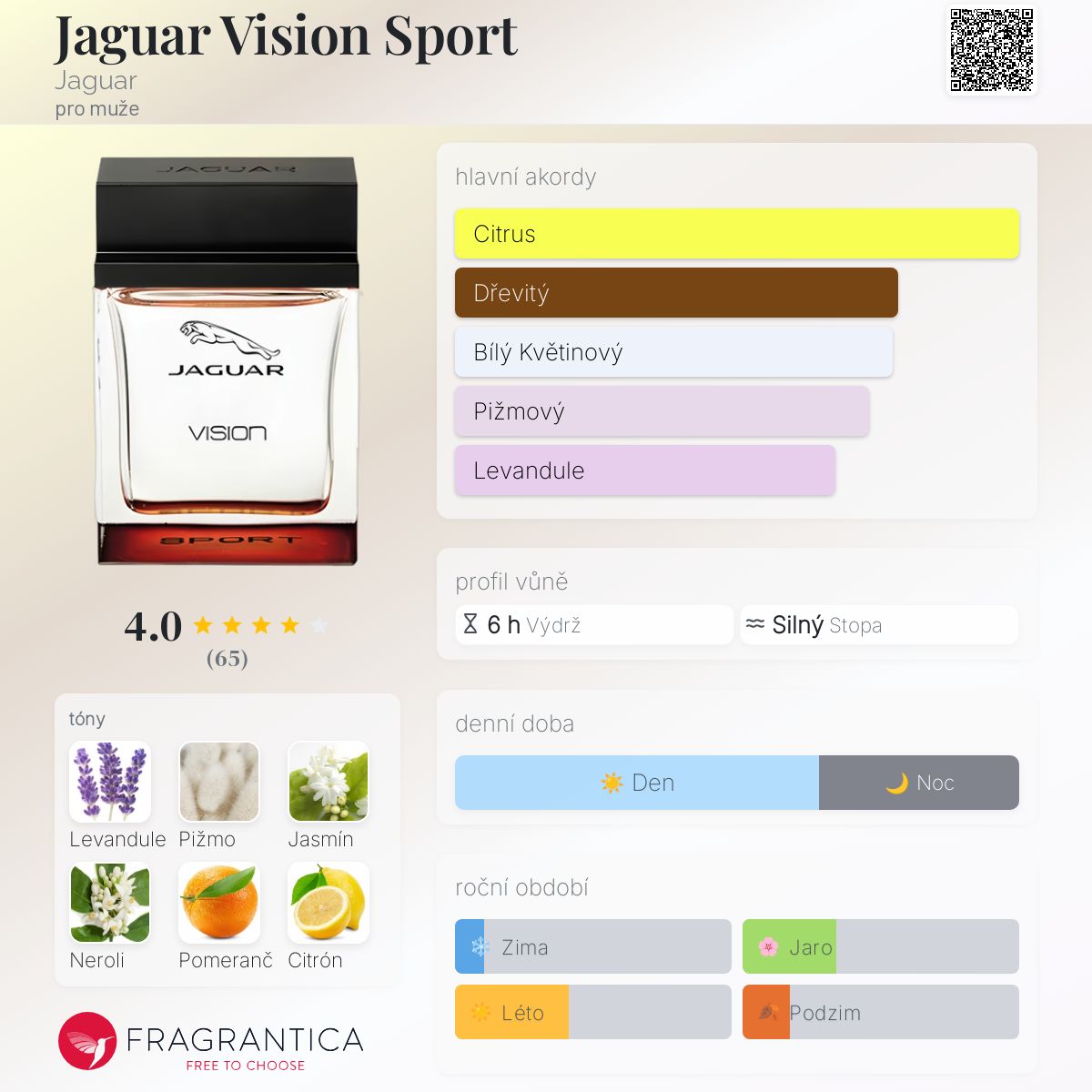 Jaguar Vision Sport podle Jaguar je Woody Floral Musk vůně pro muže. Jaguar Vision Sport byl/a uveden/a v roce 2015. "Nosem" za touto vůní je Dominique Preyssas. Vrchní tóny jsou Pomeranč, Citrón a Růžový pepř; střední tóny jsouLevandule, Jasmín a Neroli ; základní tóny jsou Pižmo, Cedr, Pačuli a Jantar (ambra).