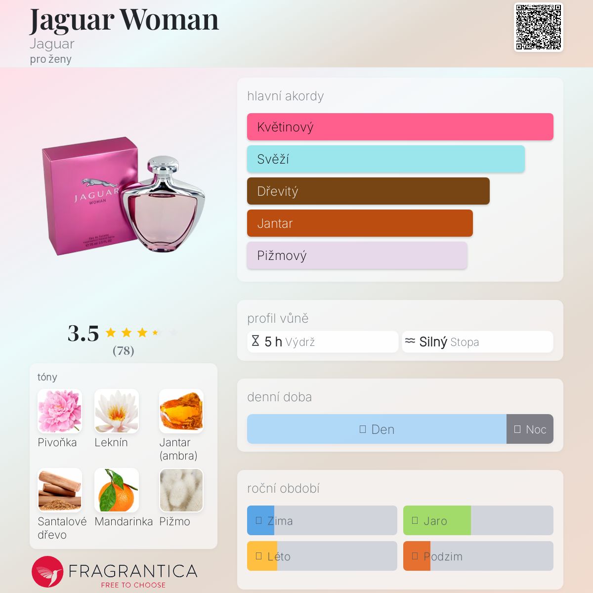 Jaguar Woman podle Jaguar je Floral Fruity vůně pro ženy. Jaguar Woman byl/a uveden/a v roce 2004. Jaguar Woman byl/a vytvořen/a Bernard Ellena a Maurice Roucel. Vrchní tóny jsou Mandarinka, Červený rybíz a Vodní meloun; střední tóny jsouPivoňka, Leknín a Jasmín Sambac ; základní tóny jsou Jantar (ambra), Santalové dřevo, Bílé pižmo a Kašmírové dřevo.
