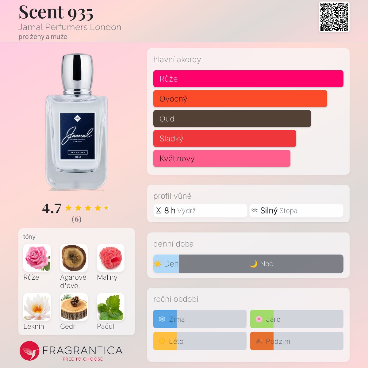 Scent 935 podle Jamal Perfumers London je Orientální Woody vůně pro ženy a muže. Scent 935 byl/a uveden/a v roce 2019. "Nosem" za touto vůní je Mohammed Jamal. Vrchní tóny jsou Leknín a Bergamot; střední tóny jsouRůžový olej, Cedr a Jasmín ; základní tóny jsou Agarové dřevo (oud), Maliny, Pačuli, Jantar (ambra), Švestka a Pižmo.