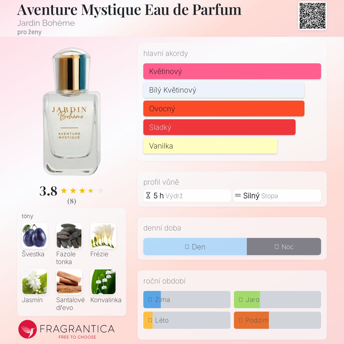 Aventure Mystique Eau de Parfum podle Jardin Bohème je Orientální Floral vůně pro ženy. Aventure Mystique Eau de Parfum byl/a uveden/a v roce 2020. Vrchní tóny jsou Švestka a Frézie; střední tóny jsouEgyptský jasmín, Konvalinka a Pivoňka ; základní tóny jsou Fazole tonka a Santalové dřevo.