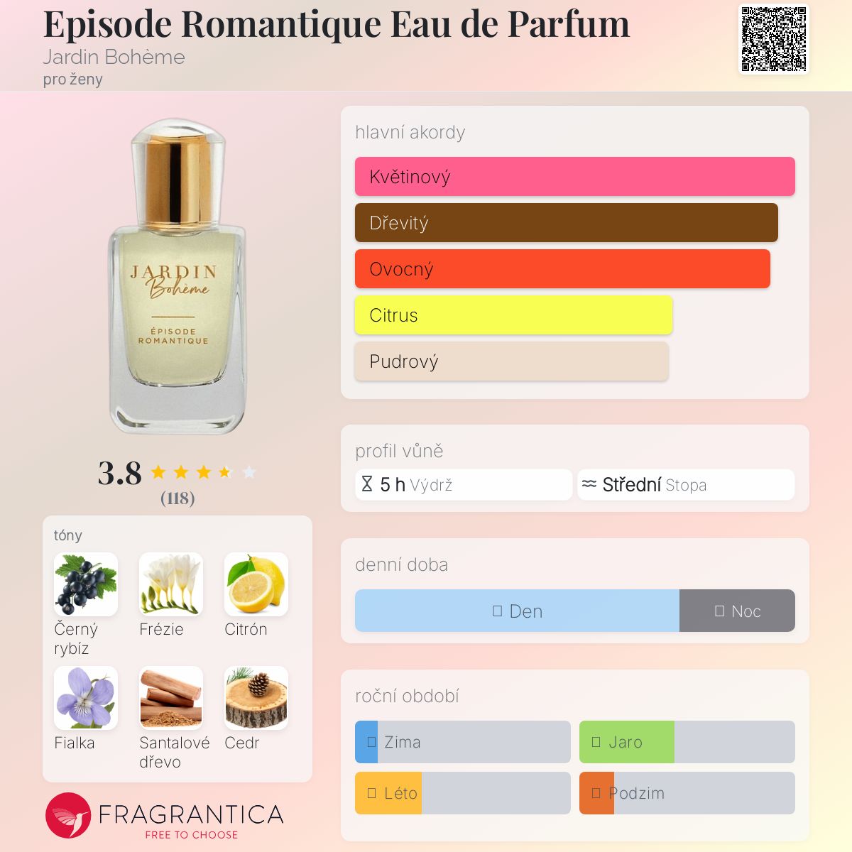 Episode Romantique Eau de Parfum podle Jardin Bohème je Orientální Floral vůně pro ženy. Episode Romantique Eau de Parfum byl/a uveden/a v roce 2020. Vrchní tóny jsou Černý rybíz, Frézie, Fialka a Jasmín; střední tóny jsouSicilský citron, Santalové dřevo a Cedr ; základní tón je Jantar (ambra).