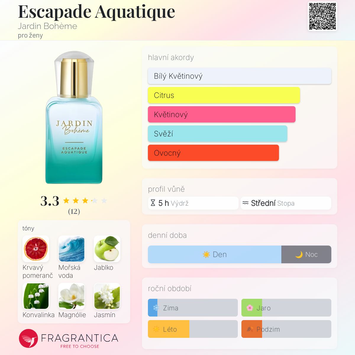 Escapade Aquatique podle Jardin Bohème je Floral Fruity vůně pro ženy. Escapade Aquatique byl/a uveden/a v roce 2023. Vrchní tóny jsou Krvavý pomeranč, Mořské tóny a Zelené jablko; střední tóny jsouKonvalinka, Magnólie a Jasmín ; základní tóny jsou Cedr, Vanilka a Jantar (ambra).