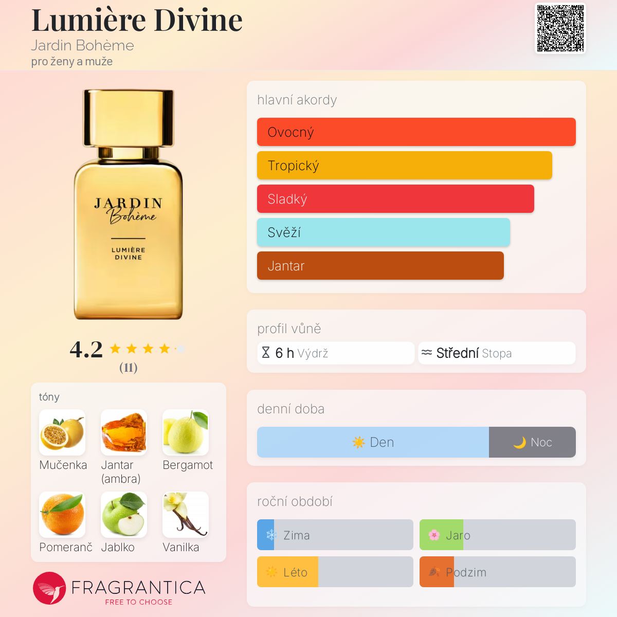Lumière Divine podle Jardin Bohème je Floral Fruity Gourmand vůně pro ženy a muže. Lumière Divine byl/a uveden/a v roce 2023. Vrchní tóny jsou Bergamot a Pomeranč; střední tóny jsouMučenka a Jablko ; základní tóny jsou Jantar (ambra) a Vanilka.