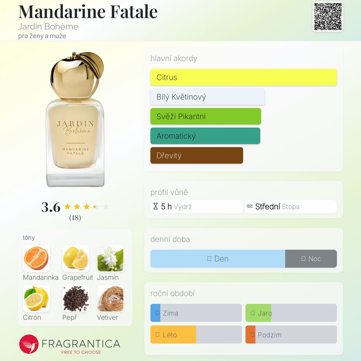 Mandarine Fatale podle Jardin Bohème je Citrus Aromatic vůně pro ženy a muže. Toto je nová vůně. Mandarine Fatale byl/a uveden/a v roce 2025. Vrchní tóny jsou Mandarinka, Grapefruit a Citrón; střední tóny jsouJasmín a Pepř ; základní tón je Vetiver.