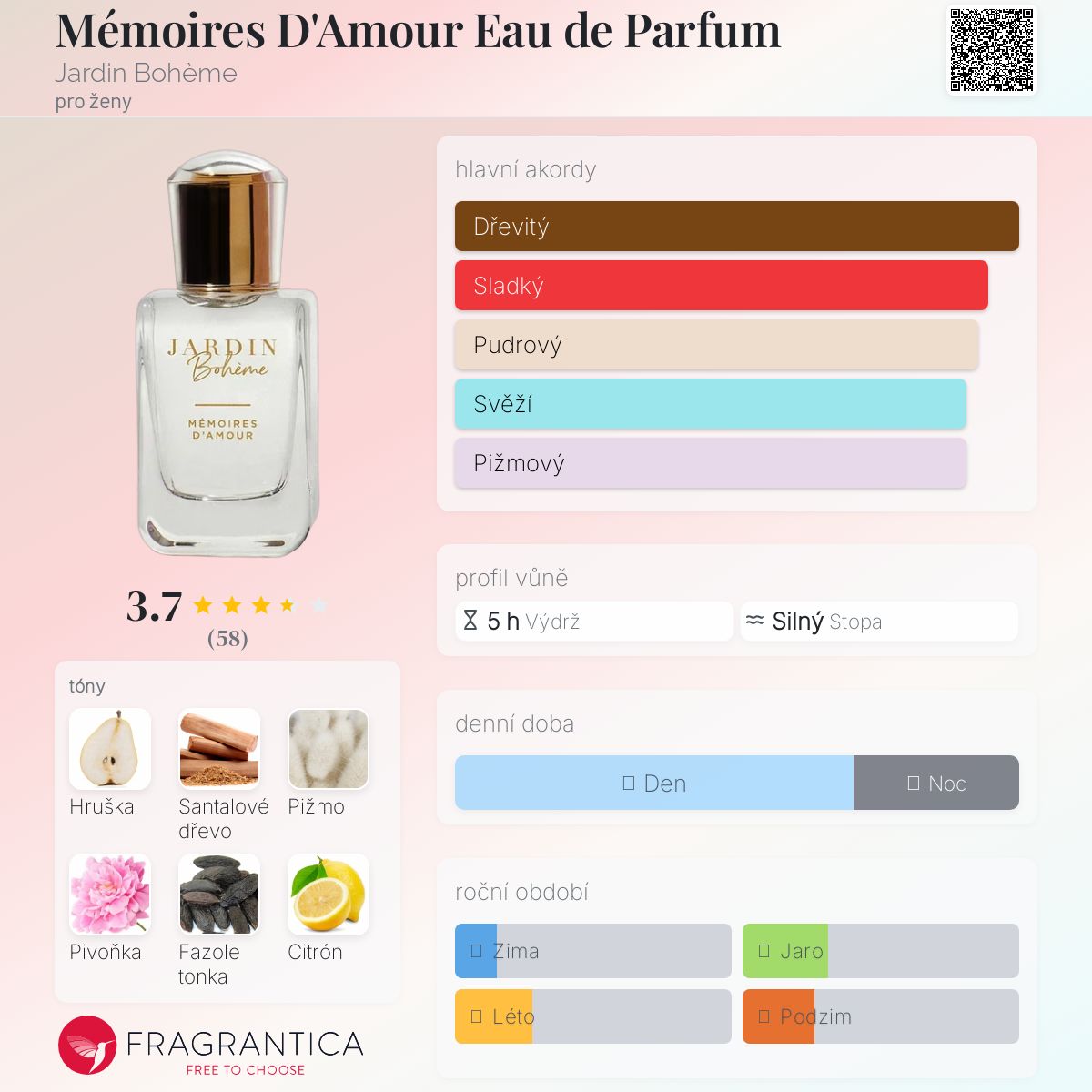 Mémoires D'Amour Eau de Parfum podle Jardin Bohème je Floral Fruity vůně pro ženy. Mémoires D'Amour Eau de Parfum byl/a uveden/a v roce 2020. Vrchní tóny jsou Hruška a Italský citrón; střední tóny jsouPivoňka a Ylang-Ylang ; základní tóny jsou Santalové dřevo, Bílé pižmo a Fazole tonka.