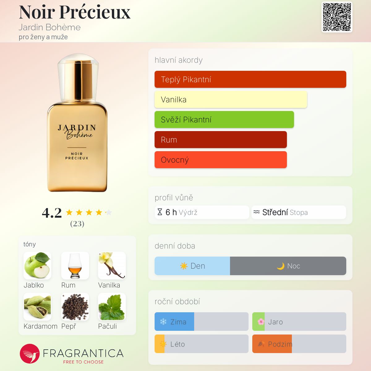 Noir Précieux podle Jardin Bohème je vůně pro ženy a muže. Toto je nová vůně. Noir Précieux byl/a uveden/a v roce 2024. Vrchní tóny jsou Jablko, Kardamom a Pepř; střední tóny jsouRum, Konvalinka a Růže ; základní tóny jsou Vanilka, Pačuli a Fazole tonka.
