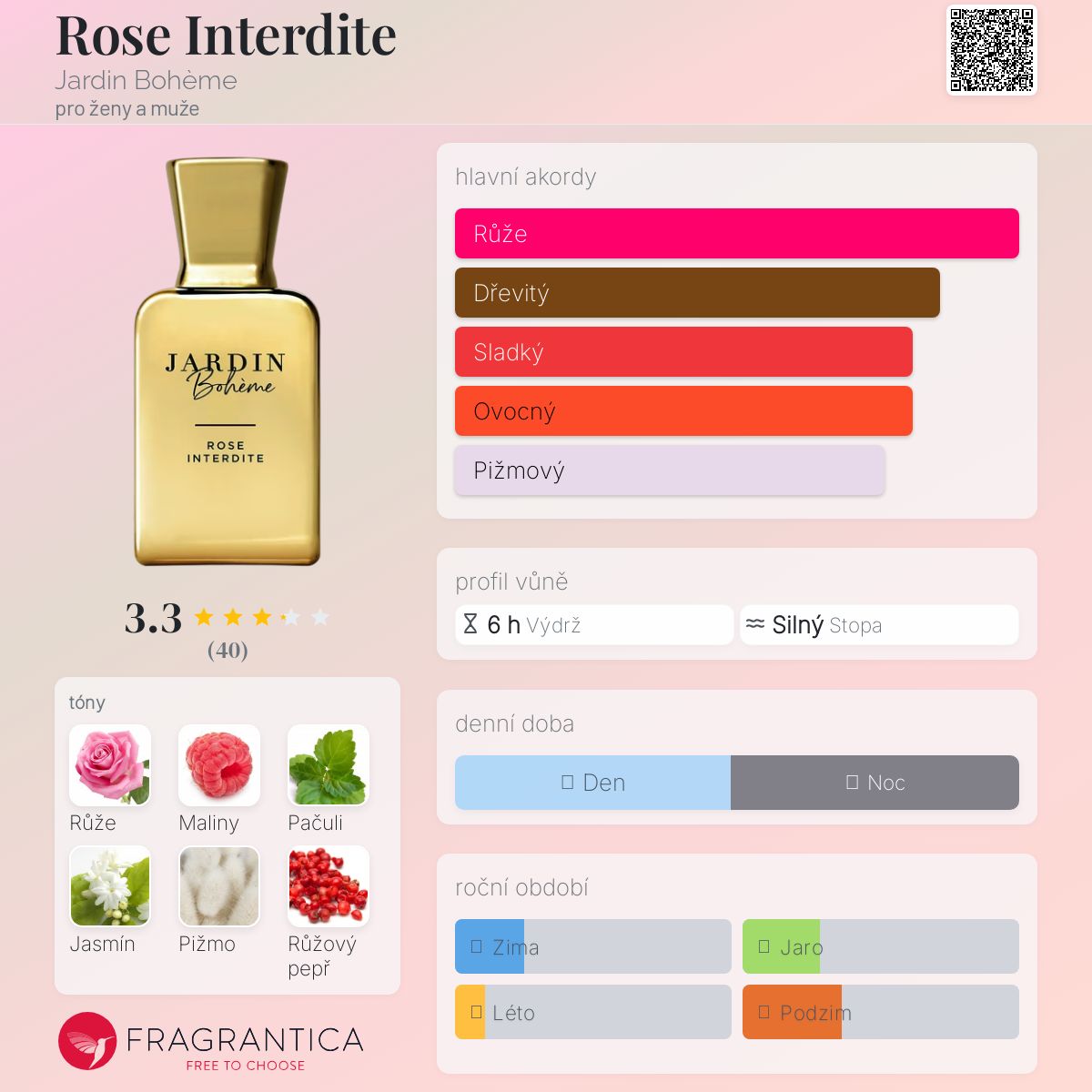 Rose Interdite podle Jardin Bohème je vůně pro ženy a muže. Toto je nová vůně. Rose Interdite byl/a uveden/a v roce 2022. Vrchní tóny jsou Růže, Růžový pepř a Bergamot; střední tóny jsouMaliny, Pačuli a Jasmín ; základní tóny jsou Pižmo, Santalové dřevo a Vanilka.