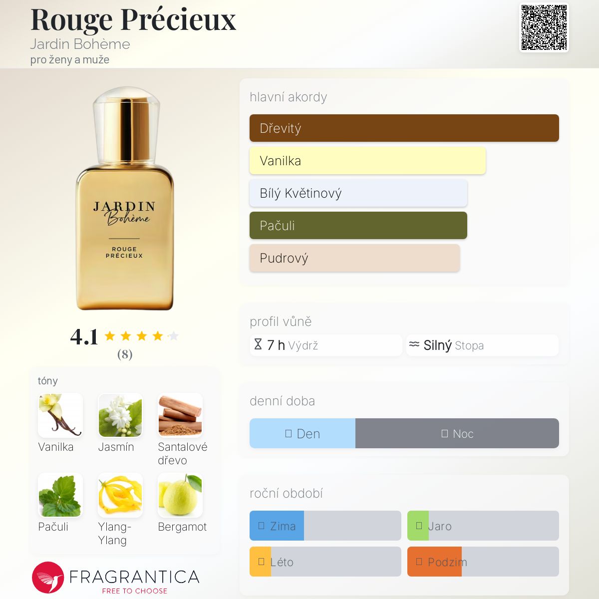 Rouge Précieux podle Jardin Bohème je Orientální Floral vůně pro ženy a muže. Rouge Précieux byl/a uveden/a v roce 2023. Vrchní tóny jsou Bergamot, Levandule a Růžový pepř; střední tóny jsouJasmín a Ylang-Ylang ; základní tóny jsou Vanilka, Santalové dřevo a Pačuli.
