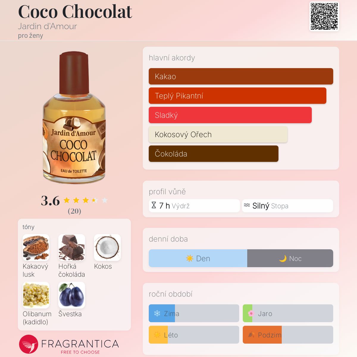 Coco Chocolat podle Jardin d'Amour je Orientální Vanilla vůně pro ženy. Coco Chocolat byl/a uveden/a v roce 2010. Vrchní tón je Kokos ; střední tóny jsouKakao a Mléčná čokoláda ; základní tóny jsou Olibanum a Švestka.