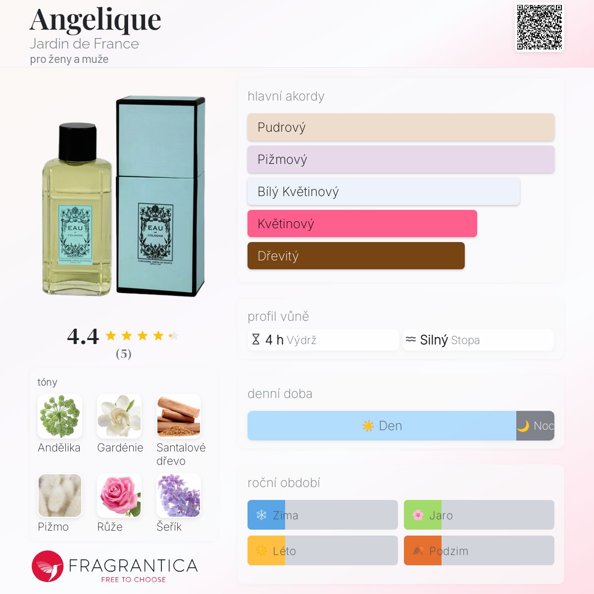 Angelique podle Jardin de France je Orientální vůně pro ženy a muže. "Nosem" za touto vůní je Expressions Parfumees Grasse. Vrchní tón je Andělika ; střední tóny jsouGardénie, Růže, Šeřík a Konvalinka ; základní tóny jsou Santalové dřevo, Pižmo a Kosatec.